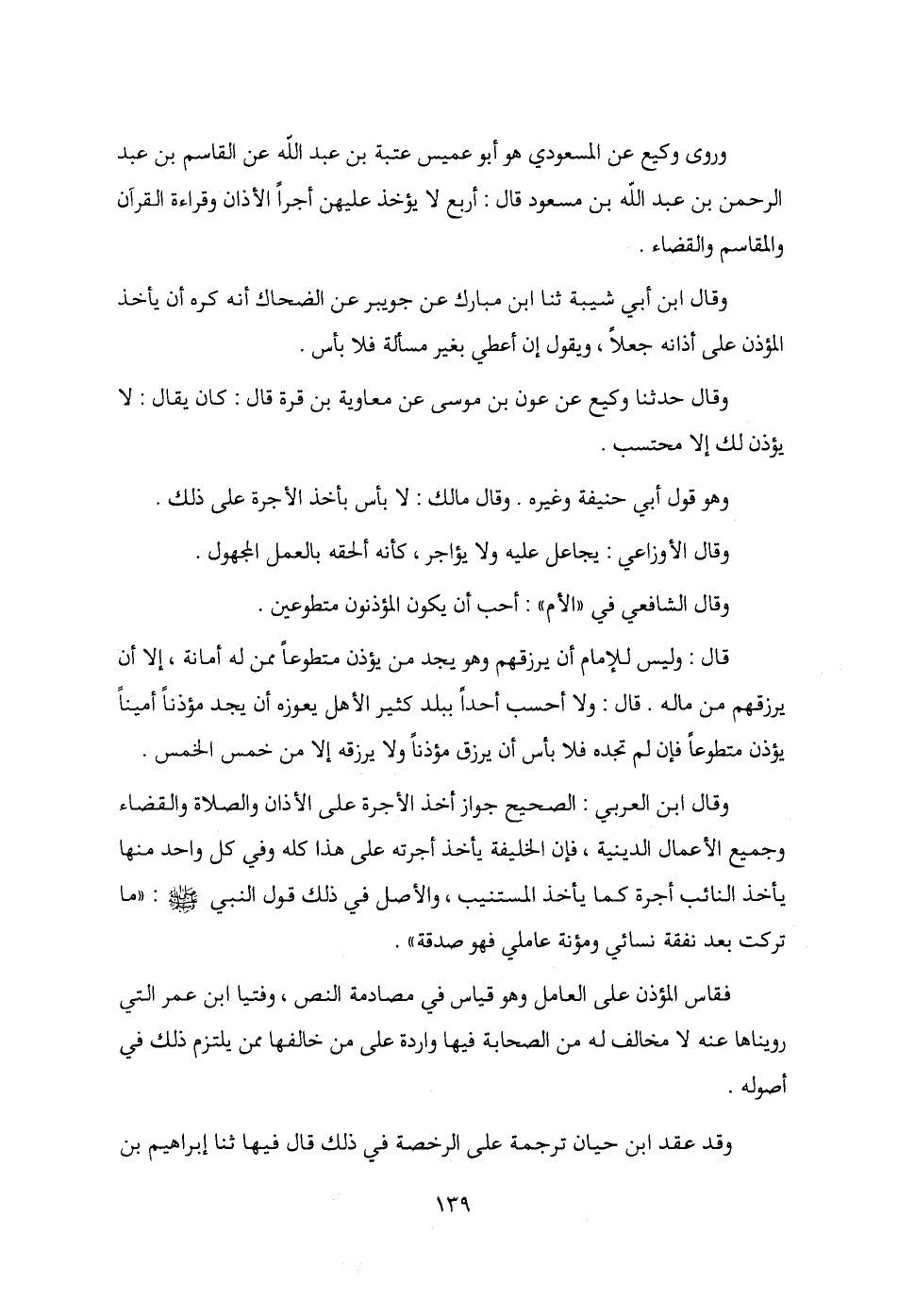 وروى وكيع عن المسعودي هو أبو عميس عتبة بن عبد الله عن القاسم بن عبد الرحمن بن عبد الله بن مسعود قال: أربع لا يؤخذ عليهن أجرًا الأذان وقراءة القرآن والمقاسم والقضاء.