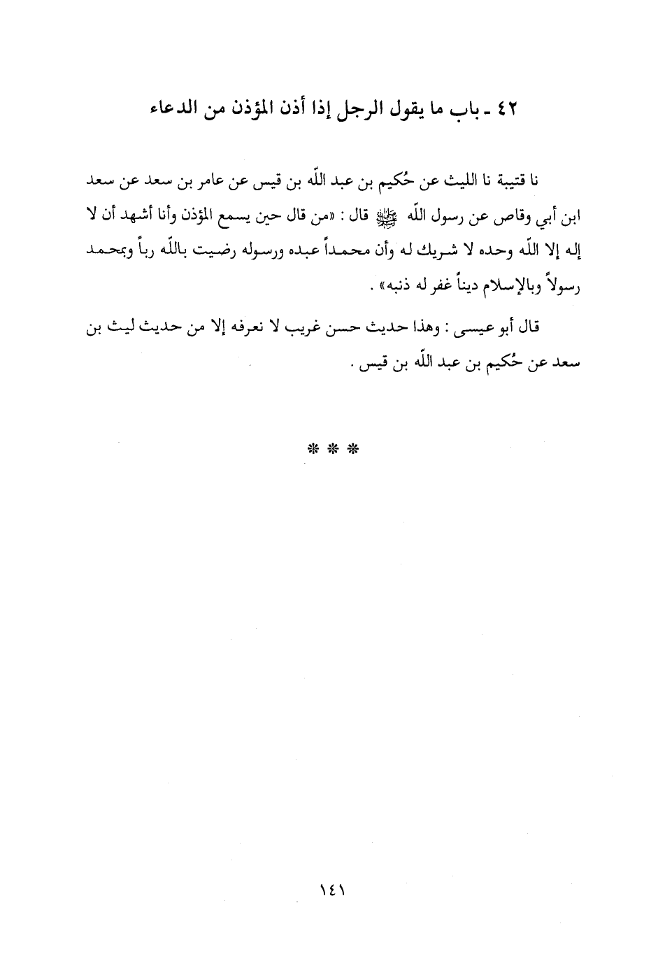 نا قتيبة نا الليث عن حُكيم بن عبد الله بن قيس عن عامر بن سعد عن سعد بن أبي وقاص عن رسول الله - صلى الله عليه وسلم - قال: "من قال حين يسمع المؤذن وأنا أشهد أن لا إله إلا الله وحده لا شريك له وأن محمدًا عبده ورسوله رضيت بالله ربًا وبمحمد رسولًا وبالإسلام دينًا غفر له ذنبه".