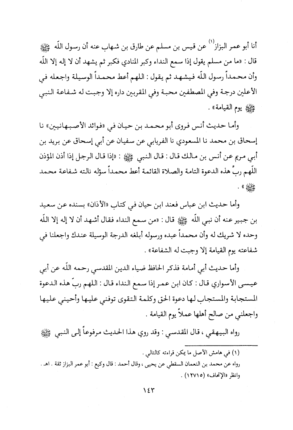 أنا أبو عمر البزاز (¬1) عن قيس بن مسلم عن طارق بن شهاب عنه أن رسول الله - صلى الله عليه وسلم - قال: "ما من مسلم يقول إذا سمع النداء وكبر المنادي فكبر ثم يشهد أن لا إله إلا الله وأن محمدًا رسول الله فيشهد ثم يقول: اللهم أعط محمدًا الوسيلة واجعله في الأعلين درجة وفي المصطفين محبة وفي المقربين داره إلا وجبت له شفاعة النبي - صلى الله عليه وسلم - يوم القيامة".
