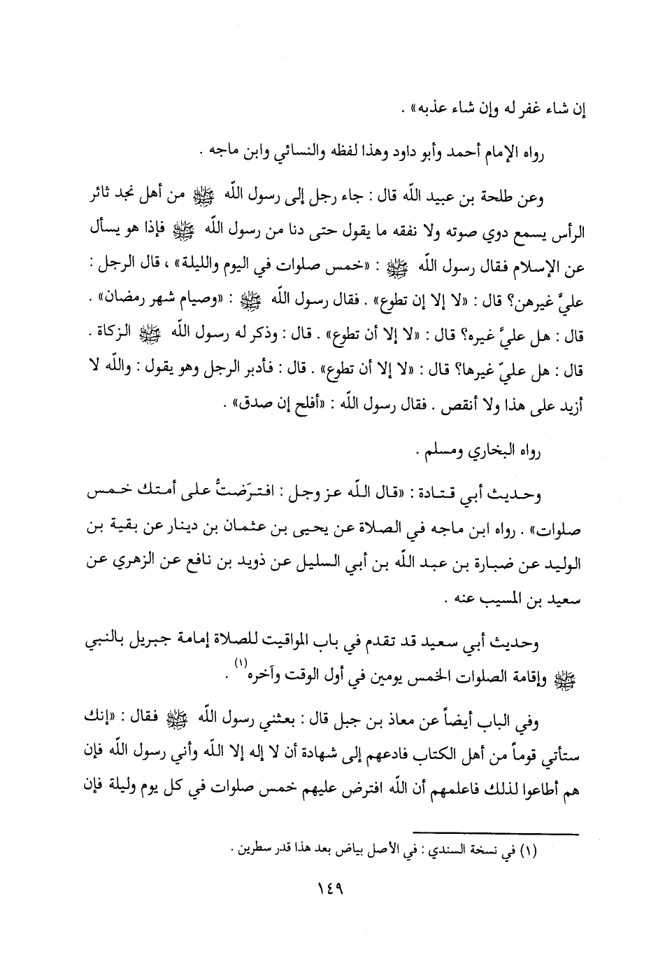 وعن طلحة بن عبيد الله قال: جاء رجل إلى رسول الله - صلى الله عليه وسلم - صلى الله عليه وسلم - من أهل نجد ثائر الرأس يسمع دوي صوته ولا نفقه ما يقول حتى دنا من رسول الله - صلى الله عليه وسلم - فإذا هو يسأل عن الإسلام فقال رسول الله - صلى الله عليه وسلم -: "خمس صلوات في اليوم والليلة"، قال الرجل: عليَّ غيرهن؟ قال: "لا إلا إن تطوع". فقال رسول الله - صلى الله عليه وسلم -: "وصيام شهر رمضان". قال: هل عليَّ غيره؟ قال: "لا إلا أن تطوع". قال: وذكر له رسول الله - صلى الله عليه وسلم - الزكاة. قال: هل عليّ غيرها؟ قال: "لا إلا أن تطوع". قال: فأدبر الرجل وهو يقول: والله لا أزيد على هذا ولا أنقص. فقال رسول الله - صلى الله عليه وسلم -: "أفلح إن صدق".