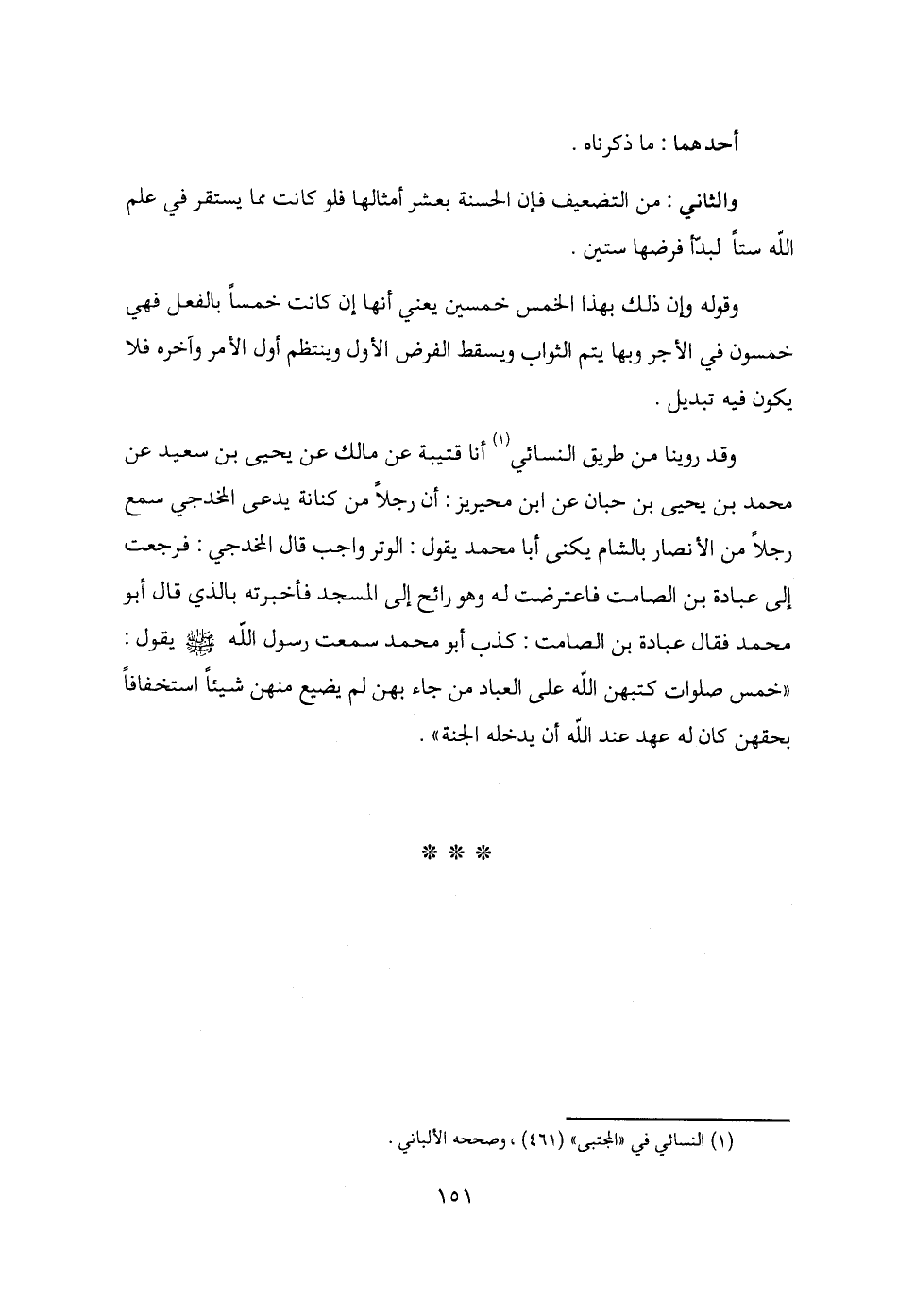 وقد روينا من طريق النسائي (¬1) أنا قتيبة عن مالك عن يحيى بن سعيد عن محمد بن يحيى بن حبان عن ابن محيريز: أن رجلًا من كنانة يدعى المخدجي سمع رجلًا من الأنصار بالشام يكنى أبا محمد يقول: الوتر واجب قال الخدجي: فرجعت إلى عبادة بن الصامت فاعترضت له وهو رائح إلى المسجد فأخبرته بالذي قال أبو محمد فقال عبادة بن الصامت: كذب أبو محمد سمعت رسول الله - صلى الله عليه وسلم - يقول: "خمس صلوات كتبهن الله على العباد من جاء بهن لم يضيع منهن شيئًا استخفافًا بحقهن كان له عهد عند الله أن يدخله الجنة".
