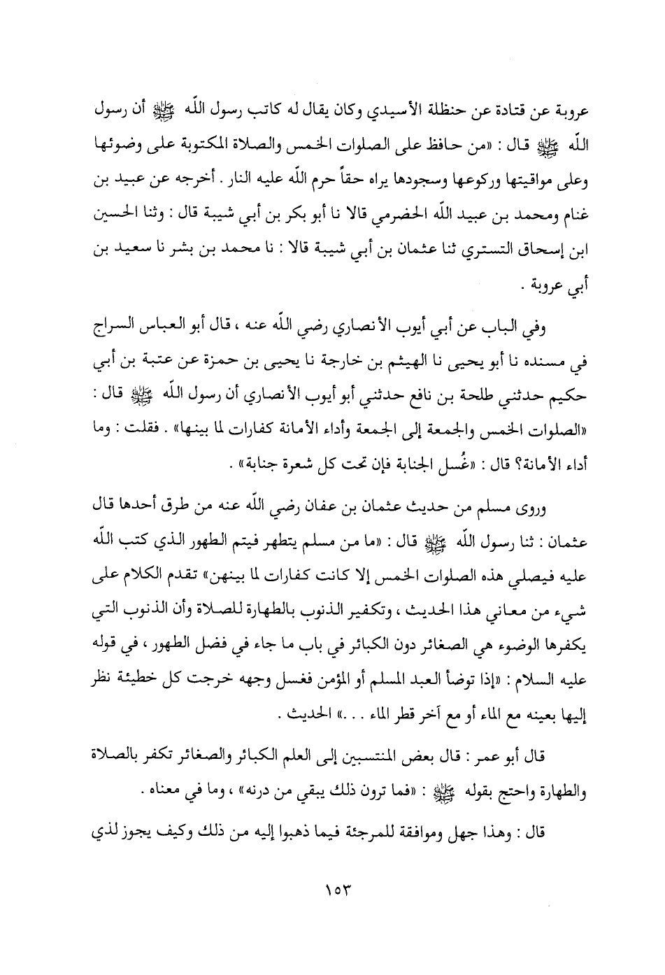 عروبة عن قتادة عن حنظلة الأسيدي وكان يقال له كاتب رسول الله - صلى الله عليه وسلم - أن رسول الله - صلى الله عليه وسلم - قال: "من حافظ على الصلوات الخمس والصلاة المكتوبة على وضوئها وعلى مواقيتها وركوعها وسجودها يراه حقًّا حرم الله عليه النار. أخرجه عن عبيد بن غنام ومحمد بن عبيد الله الحضرمي قالا نا أبو بكر بن أبي شيبة قال: وثنا الحسين بن إسحاق التستري ثنا عثمان بن أبي شيبة قالا: نا محمد بن بشر نا سعيد بن أبي عروبة.