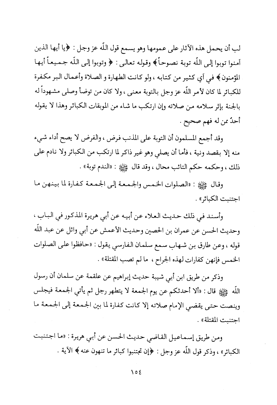 لب أن يحمل هذه الآثار على عمومها وهو يسمع قول الله عزَّ وجلَّ: {يا أيها الذين آمنوا توبوا إلى الله توبة نصوحًا} وقوله تعالى: {وتوبوا إلى الله جميعًا أيها المؤمنون} في آي كثير من كتابه، ولو كانت الطهارة والصلاة وأعمال البر مكفرة للكبائر لما كان لأمر الله عزَّ وجلَّ بالتوبة معنى، ولا كان من توضأ وصلى مشهودًا له بالجنة بإثر سلامه من صلاته وإن ارتكب ما شاء من الموبقات الكبائر وهذا لا يقوله أحدٌ ممن له فهم صحيح.