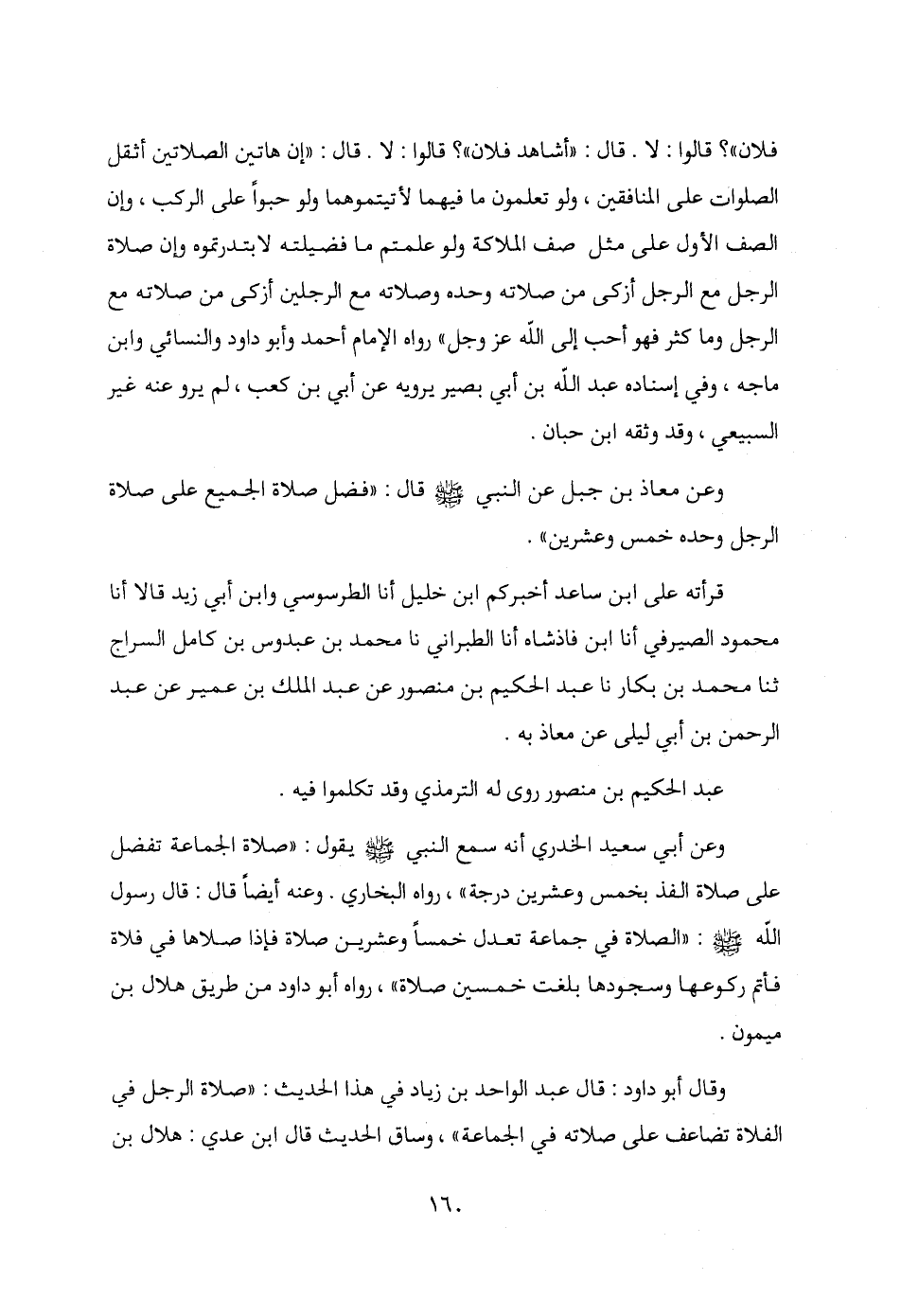 فلان"؟ قالوا: لا. قال: "أشاهد فلان"؟ قالوا: لا. قال: "إن هاتين الصلاتين أثقل الصلوات على المنافقين، ولو تعلمون ما فيهما لأتيتموهما ولو حبوًا على الركب، وإن الصف الأول على مثل صف الملاكة ولو علمتم ما فضيلته لابتدرتموه وإن صلاة الرجل مع الرجل أزكى من صلاته وحده وصلاته مع الرجلين أزكى من صلاته مع الرجل وما كثر فهو أحب إلى الله عزَّ وجلَّ" رواه الإمام أحمد وأبو داود والنسائي وابن ماجه، وفي إسناده عبد الله بن أبي بصير يرويه عن أبي بن كعب، لم يرو عنه غير السبيعي، وقد وثقه ابن حبان.