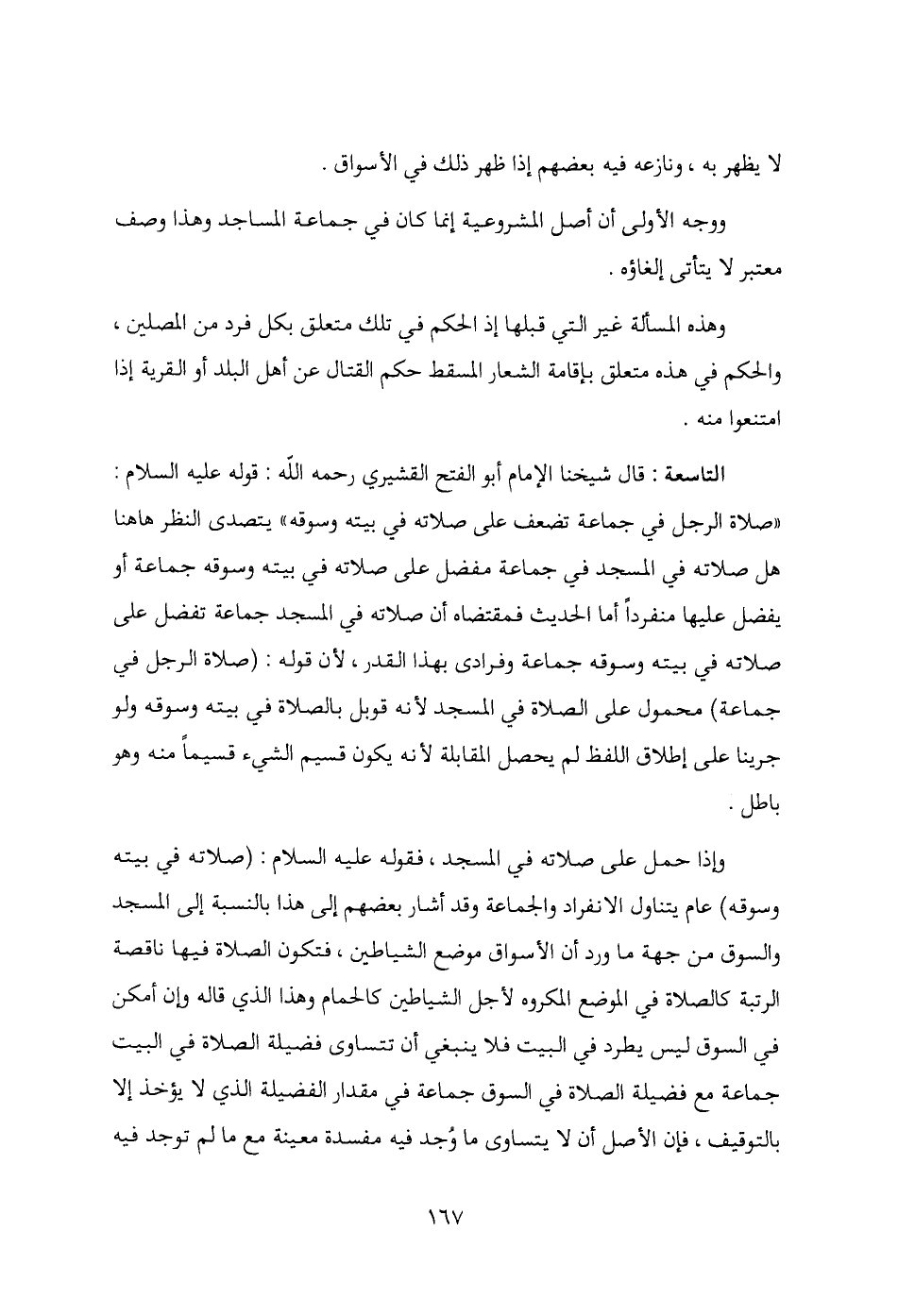 التاسعة: قال شيخنا الإمام أبو الفتح القشيري رحمه الله: قوله - عليه السلام -: "صلاة الرجل في جماعة تضعف على صلاته في بيته وسوقه" يتصدى النظر هاهنا هل صلاته في المسجد في جماعة مفضل على صلاته في بيته وسوقه جماعة أو يفضل عليها منفردًا أما الحديث فمقتضاه أن صلاته في المسجد جماعة تفضل على صلاته في بيته وسوقه جماعة وفرادى بهذا القدر، لأن قوله: (صلاة الرجل في جماعة) محمول على الصلاة في المسجد لأنه قوبل بالصلاة في بيته وسوقه ولو جرينا على إطلاق اللفظ لم يحصل القابلة لأنه يكون قسيم الشيء قسيمًا منه وهو باطل.