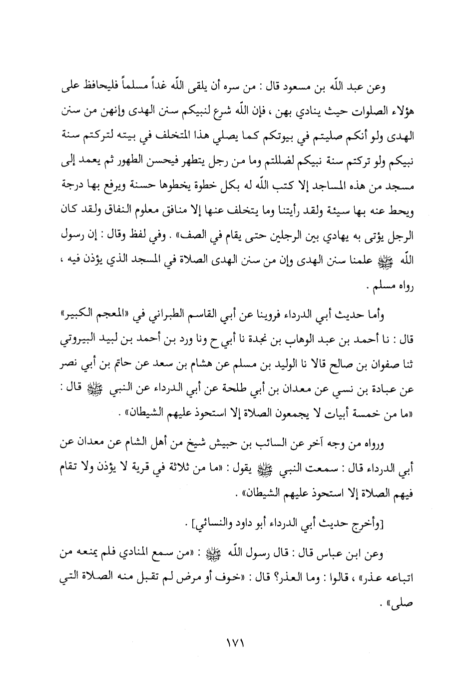 وعن عبد الله بن مسعود قال: من سره أن يلقى الله غدًا مسلمًا فليحافظ على هؤلاء الصلوات حيث ينادي بهن، فإن الله شرع لنبيكم سنن الهدى وإنهن من سنن الهدى ولو أنكم صليتم في بيوتكم كما يصلي هذا المتخلف في بيته لتركتم سنة نبيكم ولو تركتم سنة نبيكم لضللتم وما من رجل يتطهر فيحسن الطهور ثم يعمد إلى مسجد من هذه المساجد إلا كتب الله له بكل خطوة يخطوها حسنة ويرفع بها درجة ويحط عنه بها سيئة ولقد رأيتنا وما يتخلف عنها إلا منافق معلوم النفاق ولقد كان الرجل يؤتى به يهادي بين الرجلين حتى يقام في الصف". وفي لفظ وقال: إن رسول الله - صلى الله عليه وسلم - علمنا سنهن الهدى وإن من سنهن الهدى الصلاة في المسجد الذي يؤذن فيه، رواه مسلم.