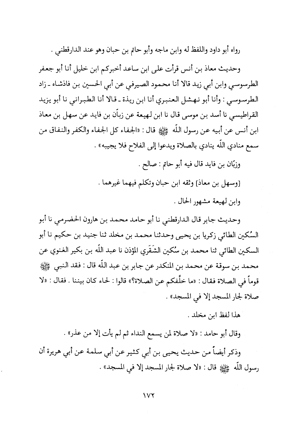 وحديث جابر قال الدارقطني نا أبو حامد محمد بن هارون الحضرمي نا أبو السُكين الطائي زكريا بن يحيى وحدثنا محمد بن مخلد ثنا جنيد بن حكيم نا أبو السكين الطائي ثنا محمد بن سُكين الشَقَري المؤذن نا عبد الله بن بكير الغنوي عن محمد بن سوقة عن محمد بن المنكدر عن جابر بن عبد الله قال: فقد النبي - صلى الله عليه وسلم - قومًا في الصلاة فقال: "ما خلَّفكم عن الصلاة؟ " قالوا: لحاء كان بيننا. فقال: "لا صلاة لجار المسجد إلا في المسجد".