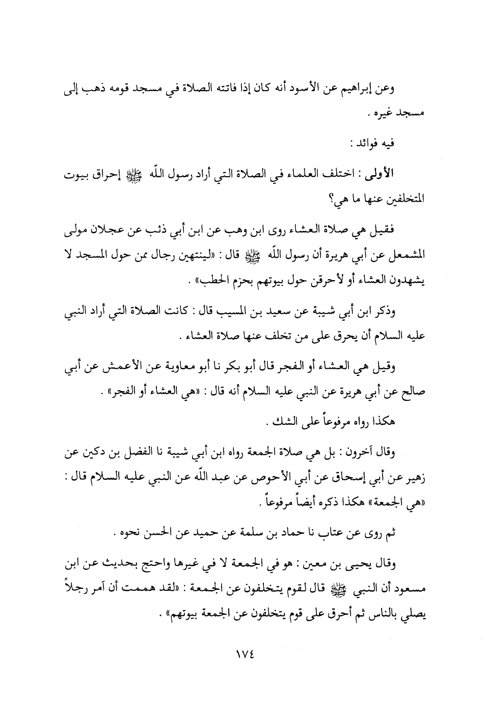 وذكر ابن أبي شيبة عن سعيد بن المسيب قال: كانت الصلاة التي أراد النبي - عليه السلام - أن يحرق على من تخلف عنها صلاة العشاء.