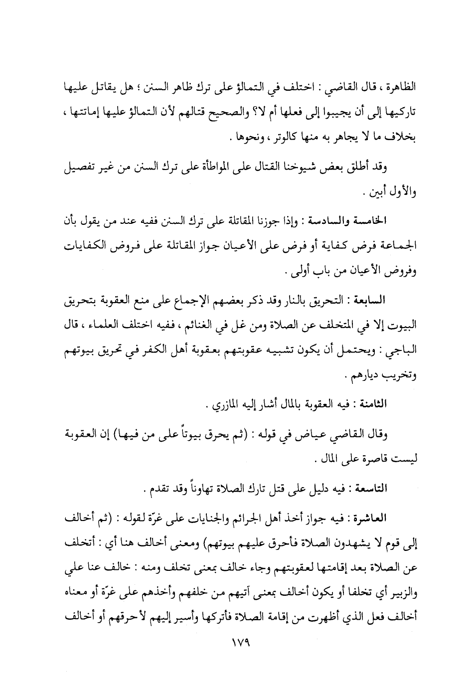 الظاهرة، قال القاضي: اختلف في التمالؤ على ترك ظاهر السنن؛ هل يقاتل عليها تاركيها إلى أن يجيبوا إلى فعلها أم لا؟ والصحيح قتالهم لأن التمالؤ عليها إماتتها، بخلاف ما لا يجاهر به منها كالوتر، ونحوها.