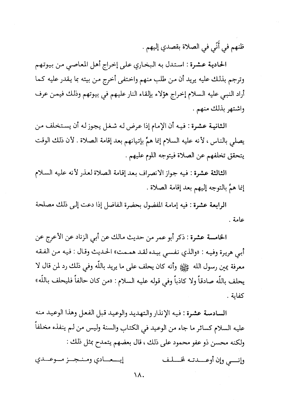 السادسة عشرة: فيه الإنذار والتهديد والوعيد قبل الفعل وهذا الوعيد منه - عليه السلام - كسائر ما جاء من الوعيد في الكتاب والسنة وليس من لم ينفذه مخلفًا ولكنه محسن ذو عفو محمود على ذلك، قال بعضهم يتمدح بمثل ذلك: