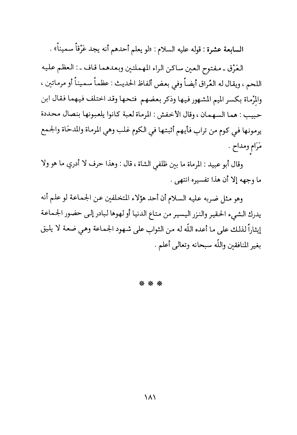 العَرْق -مفتوح العين ساكن الراء المهملتين وبعدهما قاف-: العظم عليه اللحم، ويقال له العُراق أيضًا وفي بعض ألفاظ الحديث: عظمًا سمينًا أو مرماتين، والمِرماة بكسر الميم المشهور فيها وذكر بعضهم فتحها وقد اختلف فيهما فقال ابن حبيب: هما السهمان، وقال الأخفش: المرماة لعبة كانوا يلعبونها بنصال محددة يرمونها في كوم من تراب فأيهم أثبتها في الكوم غلب وهي المرماة والمدحاة والجمع مَرامٍ ومداح.