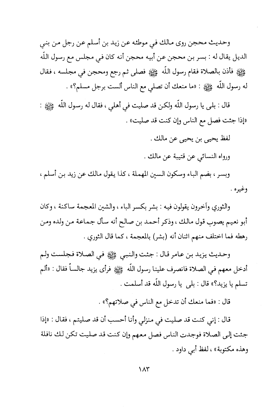 وحديث محجن روى مالك في موطئه عن زيد بن أسلم عن رجل من بني الديل يقال له: بسر بن محجن عن أبيه محجن أنه كان في مجلس مع رسول الله - صلى الله عليه وسلم - فأذن بالصلاة فقام رسول الله - صلى الله عليه وسلم - فصلى ثم رجع ومحجن في مجلسه، فقال له رسول الله - صلى الله عليه وسلم -: "ما منعك أن تصلي مع الناس ألست برجل مسلم؟ ".