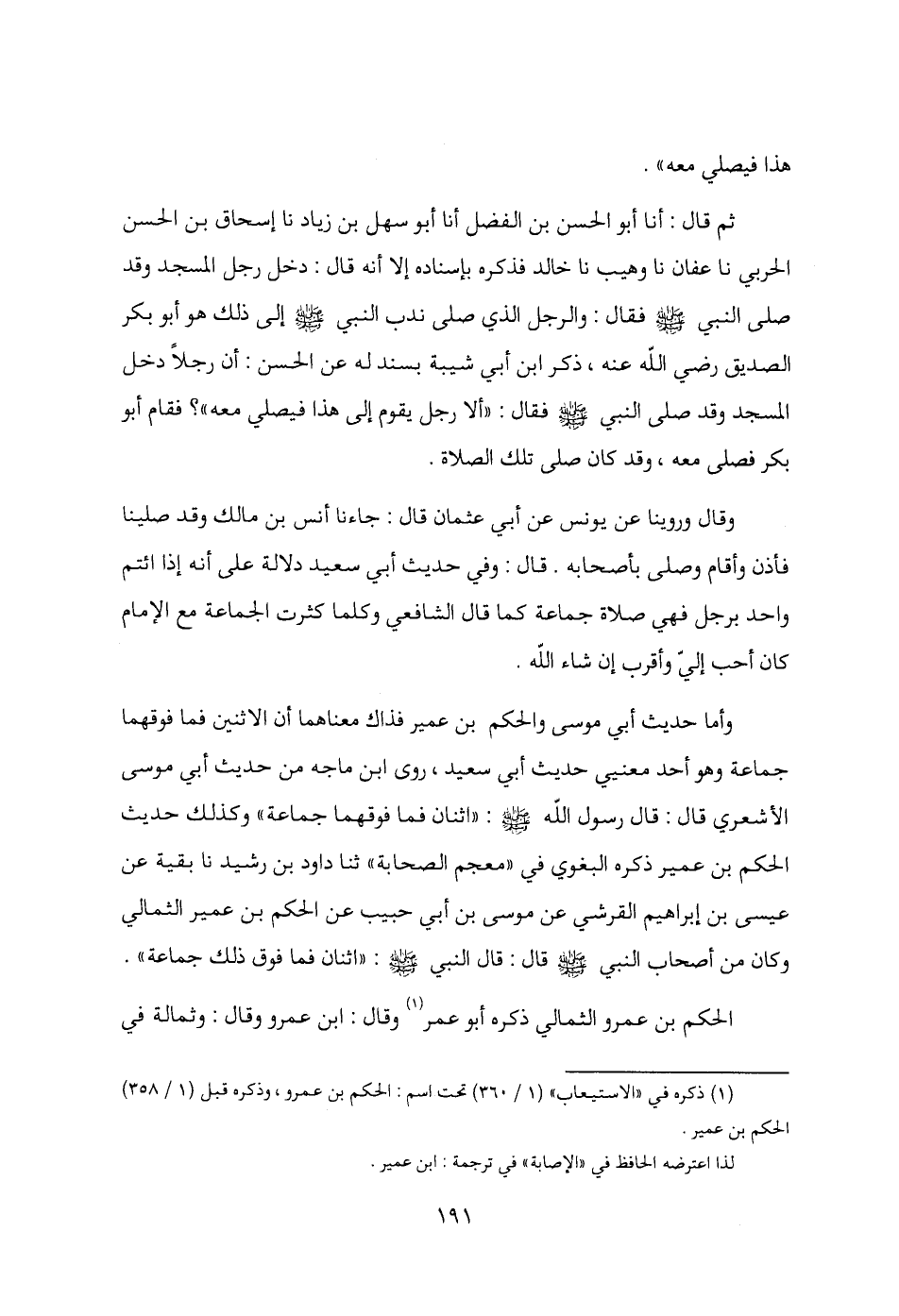 وأما حديث أبي موسى والحكم بن عمير فذاك معناهما أن الاثنين فما فوقهما جماعة وهو أحد معنيي حديث أبي سعيد، روى ابن ماجه من حديث أبي موسى الأشعري قال: قال رسول الله - صلى الله عليه وسلم -: "اثنان فما فوقهما جماعة" وكذلك حديث الحكم بن عمير ذكره البغوي في "معجم الصحابة" ثنا داود بن رشيد نا بقية عن عيسى بن إبراهيم القرشي عن موسى بن أبي حبيب عن الحكم بن عمير الثمالي وكان من أصحاب النبي - صلى الله عليه وسلم - قال: قال النبي - صلى الله عليه وسلم -: "اثنان فما فوق ذلك جماعة".