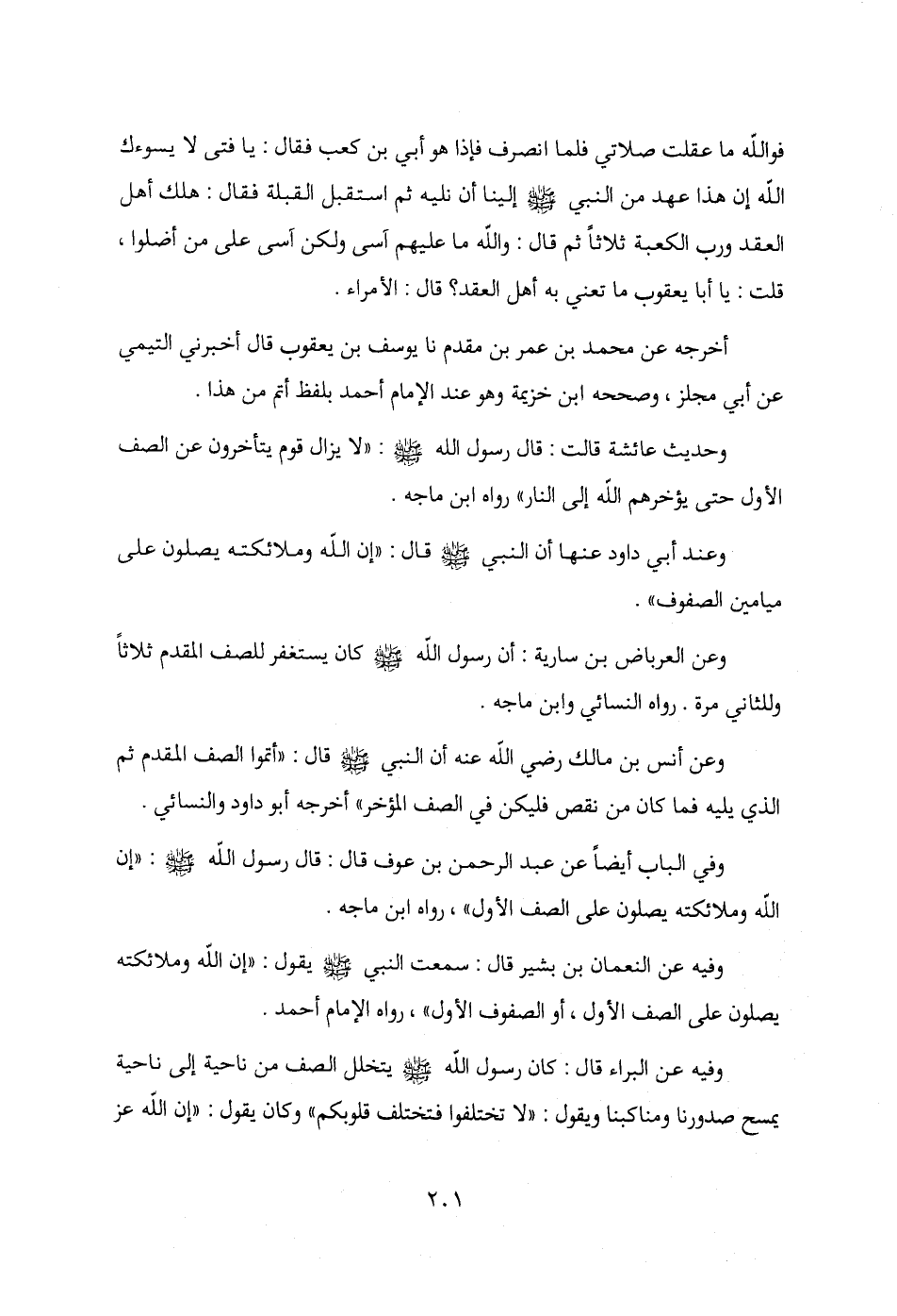 وفيه عن النعمان بن بشير قال: سمعت النبي - صلى الله عليه وسلم - يقول: "إن الله وملائكته يصلون على الصف الأول، أو الصفوف الأول"، رواه الإمام أحمد.