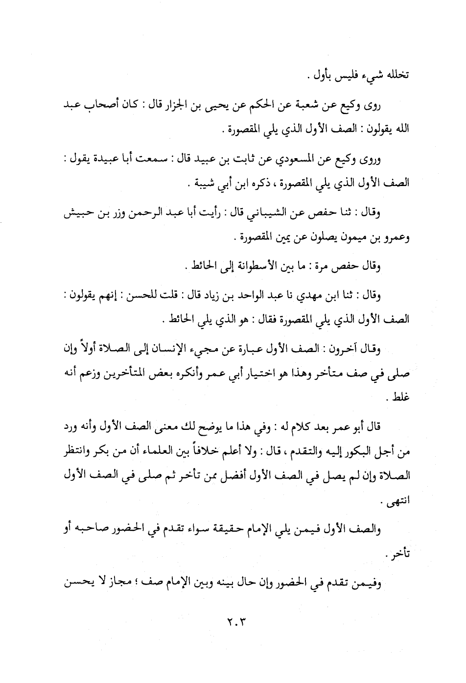 وروى وكيع عن المسعودي عن ثابت بن عبيد قال: سمعت أبا عبيدة يقول: الصف الأول الذي يلي المقصورة، ذكره ابن أبي شيبة.
