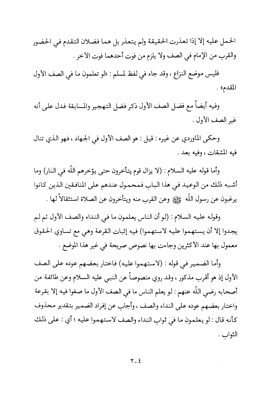 وأما الضمير في قوله: (لاستهموا عليه) فاختار بعضهم عوده على الصف الأول إذ هو أقرب مذكور، وقد روي منصوصًا عن النبي - عليه السلام - وعن طائفة من أصحابه رضي الله عنهم: لو يعلم الناس ما في الصف الأول ما صفوا فيه إلا بقرعة واختار بعضهم عوده على النداء والصف، وأجاب عن إفراد الضمير بتقدير محذوف كأنه قال: لو يعلمون ما في ثواب النداء والصف لاستهموا عليه؛ أي: على ذلك الثواب.