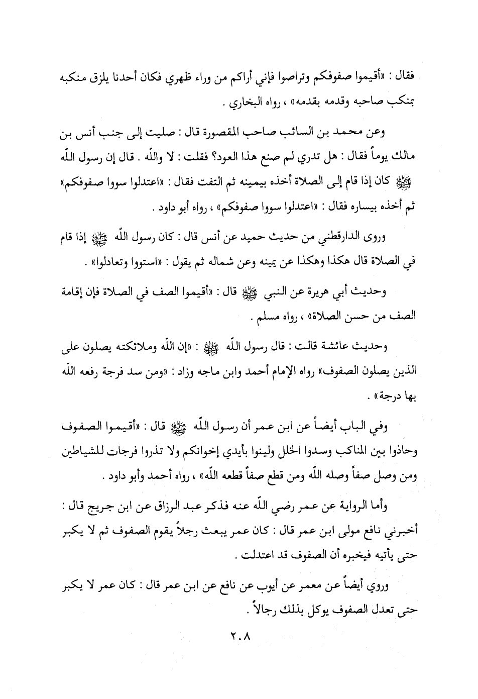 فقال: "أقيموا صفوفكم وتراصوا فإني أراكم من وراء ظهري فكان أحدنا يلزق منكبه بمنكب صاحبه وقدمه بقدمه"، رواه البخاري.