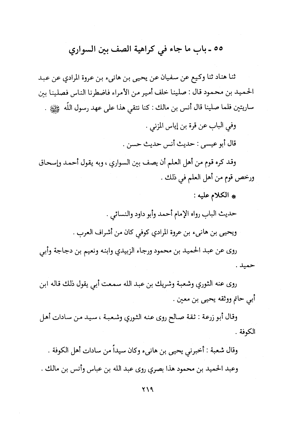 ثنا هناد ثنا وكيع عن سفيان عن يحيى بن هانئ بن عروة المرادي عن عبد الحميد بن محمود قال: صلينا خلف أمير من الأمراء فاضطرنا الناس فصلينا بين ساريتين فلما صلينا قال أنس بن مالك: كنا نتقي هذا على عهد رسول الله - صلى الله عليه وسلم -.