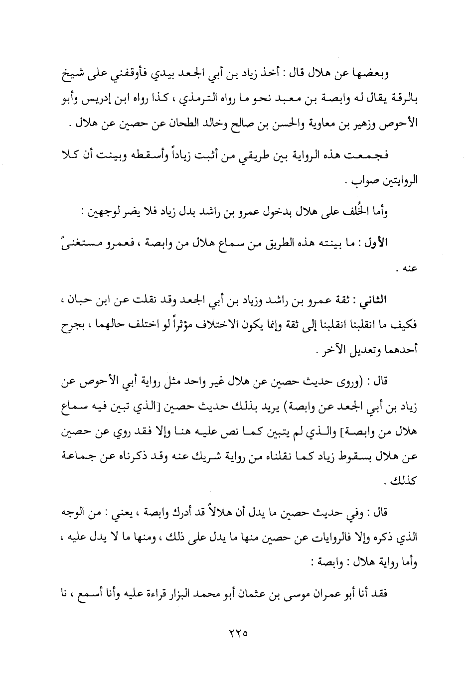 قال: (وروى حديث حصين عن هلال غير واحد مثل رواية أبي الأحوص عن زياد بن أبي الجعد عن وابصة) يريد بذلك حديث حصين [الذي تبين فيه سماع هلال من وابصة] والذي لم يتبين كما نص عليه هنا وإلا فقد روي عن حصين عن هلال بسقوط زياد كما نقلناه من رواية شريك عنه وقد ذكرناه عن جماعة كذلك.