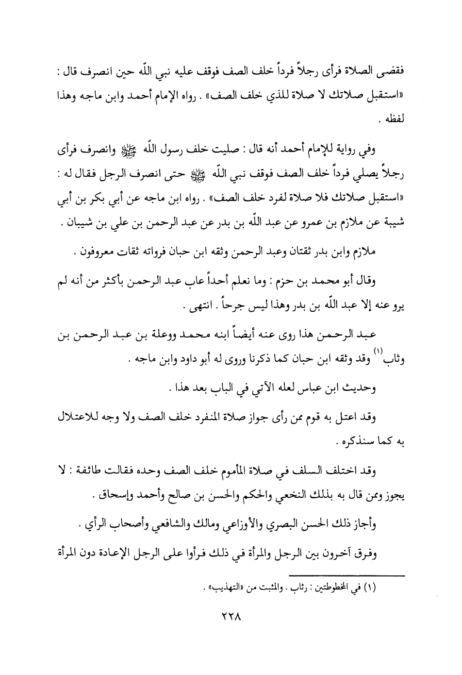 فقضى الصلاة فرأى رجلًا فردًا خلف الصف فوقف عليه نبي الله حين انصرف قال: "استقبل صلاتك لا صلاة للذي خلف الصف". رواه الإمام أحمد وابن ماجه وهذا لفظه.