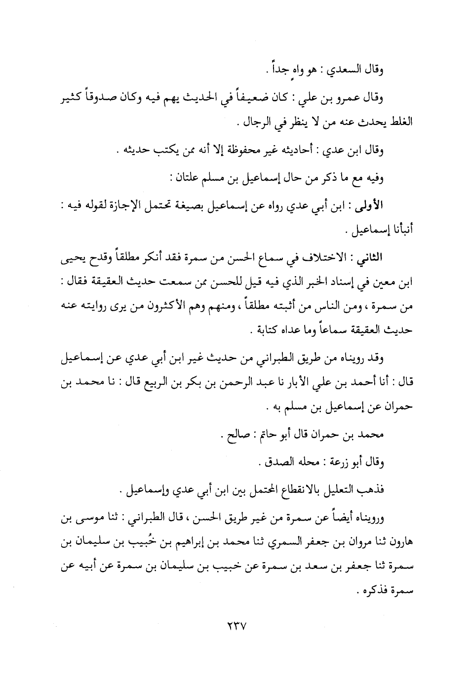 وقد رويناه من طريق الطبراني من حديث غير ابن أبي عدي عن إسماعيل قال: أنا أحمد بن علي الأبار نا عبد الرحمن بن بكر بن الربيع قال: نا محمد بن حمران عن إسماعيل بن مسلم به.