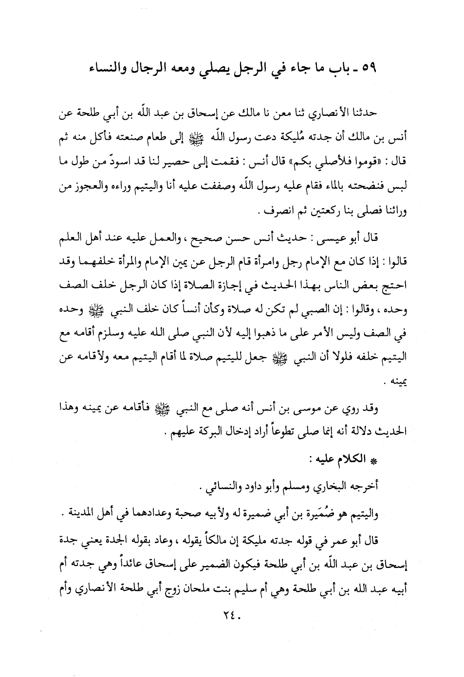 قال أبو عيسى: حديث أنس حسن صحيح، والعمل عليه عند أهل العلم قالوا: إذا كان مع الإمام رجل وامرأة قام الرجل عن يمين الإمام والمرأة خلفهما وقد احتج بعض الناس بهذا الحديث في إجازة الصلاة إذا كان الرجل خلف الصف وحده، وقالوا: إن الصبي لم تكن له صلاة وكأن أنسًا كان خلف النبي - صلى الله عليه وسلم - وحده في الصف وليس الأمر على ما ذهبوا إليه لأن النبي صلى الله عليه ويلزم أقامه مع اليتيم خلفه فلولا أن النبي - صلى الله عليه وسلم - جعل لليتيم صلاة لما أقام اليتيم معه ولأقامه عن يمينه.