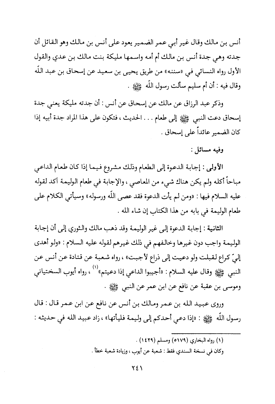 الأولى: إجابة الدعوة إلى الطعام وذلك مشروع فيما إذا كان طعام الداعي مباحًا أكله ولم يكن هناك شيء من المعاصي، والإجابة في طعام الوليمة آكد لقوله - عليه السلام - فيها: "ومن لم يأت الدعوة فقد عصى الله ورسوله" وسيأتي الكلام على طعام الوليمة في بابه من هذا الكتاب إن شاء الله.