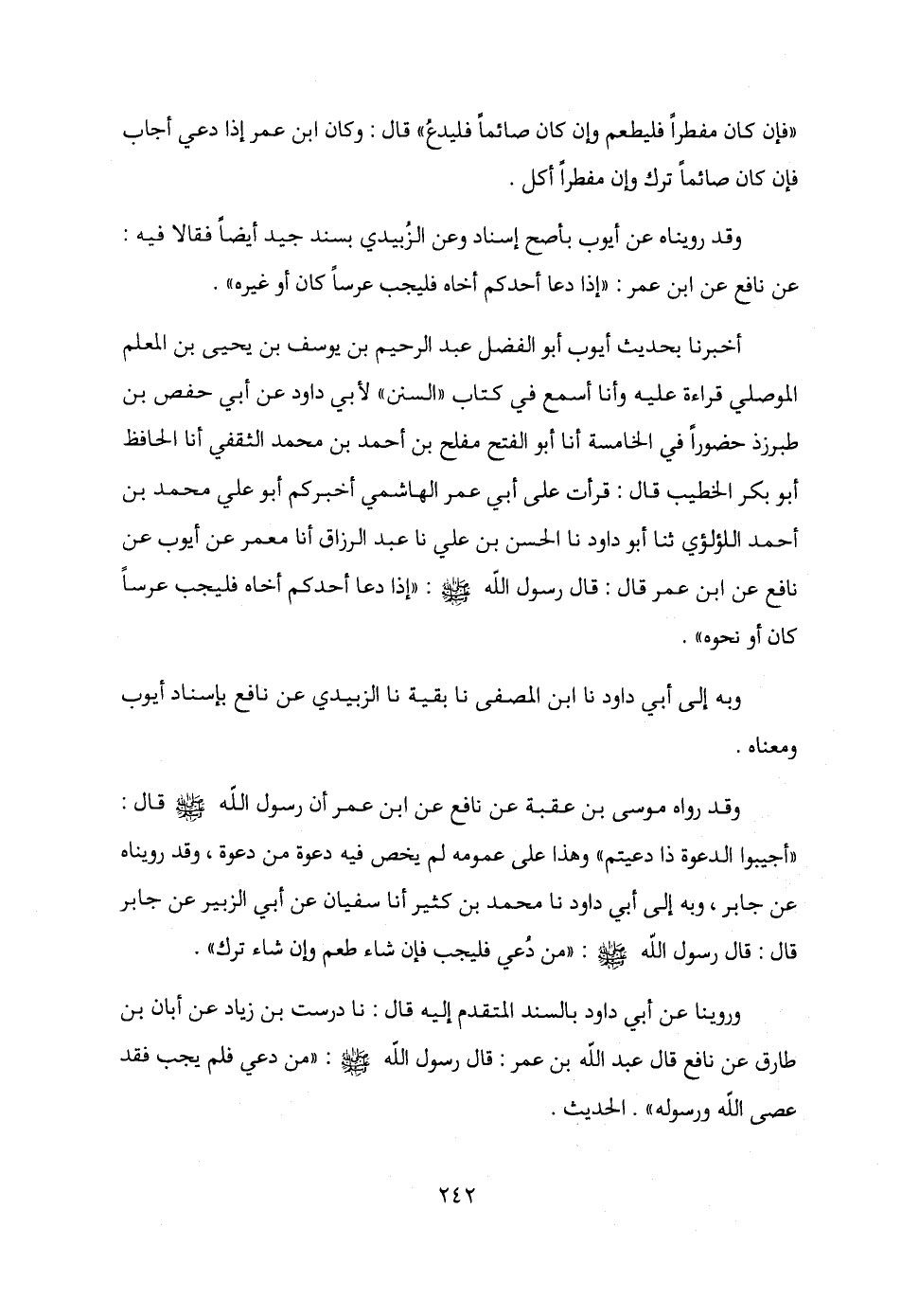 وروينا عن أبي داود بالسند المتقدم إليه قال: نا درست بن زياد عن أبان بن طارق عن نافع قال عبد الله بن عمر: قال رسول الله - صلى الله عليه وسلم -: "من دعي فلم يجب فقد عصى الله ورسوله". الحديث.