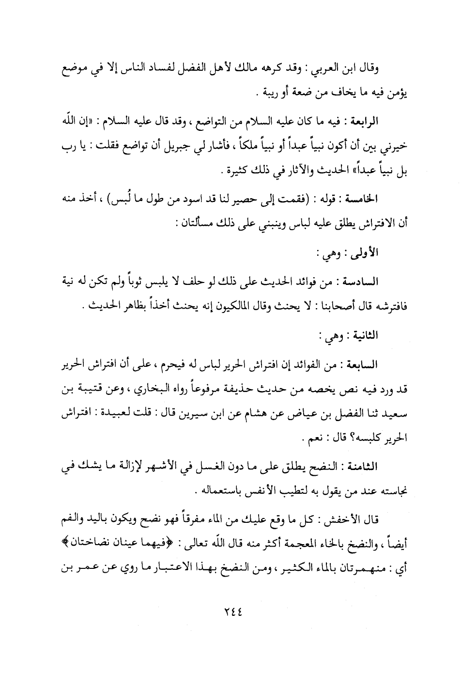 السابعة: من الفوائد إن افتراش الحرير لباس له فيحرم، على أن افتراش الحرير قد ورد فيه نص يخصه من حديث حذيفة مرفوعًا رواه البخاري، وعن قتيبة بن سعيد ثنا الفضل بن عياض عن هشام عن ابن سيرين قال: قلت لعبيدة: افتراش الحرير كلبسه؟ قال: نعم.