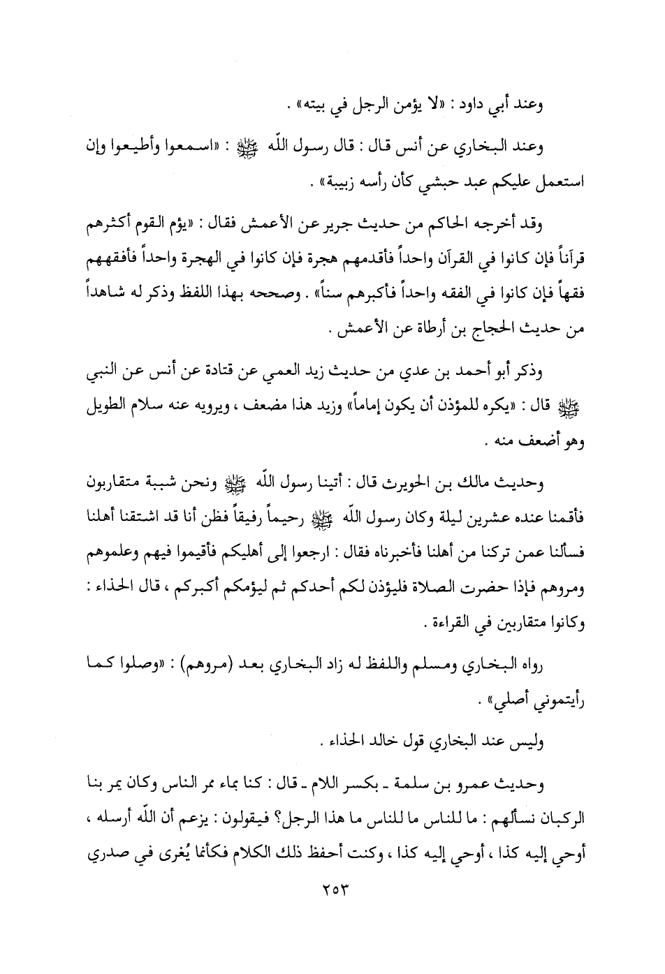 وحديث مالك بن الحويرث قال: أتينا رسول الله - صلى الله عليه وسلم - ونحن شببة متقاربون فأقمنا عنده عشرين ليلة وكان رسول الله - صلى الله عليه وسلم - رحيمًا رفيقًا فظن أنا قد اشتقنا أهلنا فسألنا عمن تركنا من أهلنا فأخبرناه فقال: ارجعوا إلى أهليكم فأقيموا فيهم وعلموهم ومروهم فإذا حضرت الصلاة فليؤذن لكم أحدكم ثم ليؤمكم أكبركم، قال الحذاء: وكانوا متقاربين في القراءة.