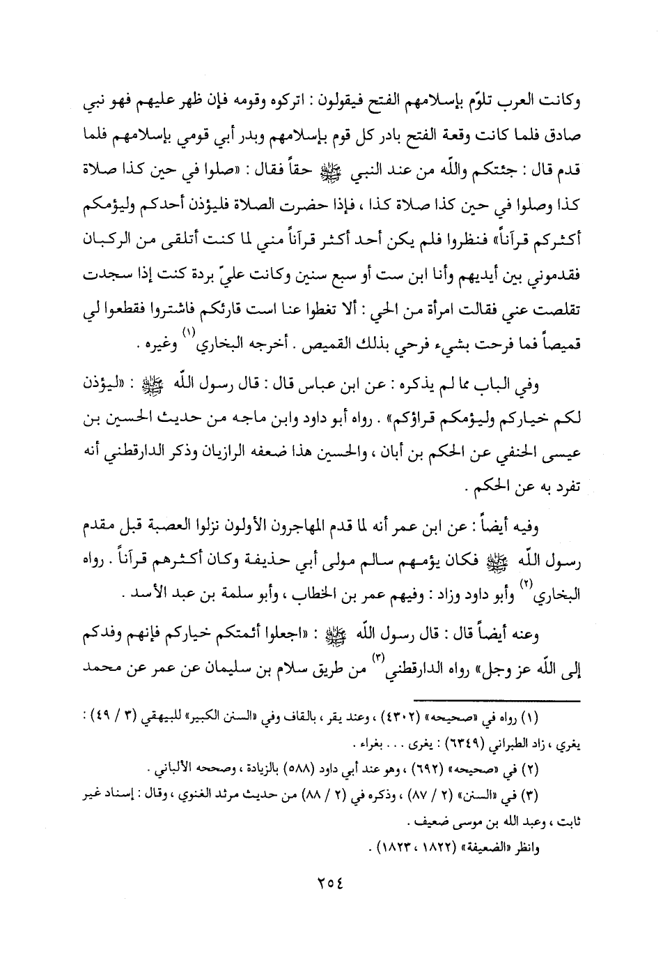 وكانت العرب تلوّم بإسلامهم الفتح فيقولون: اتركوه وقومه فإن ظهر عليهم فهو نبي صادق فلما كانت وقعة الفتح بادر كل قوم بإسلامهم وبدر أبي قومي بإسلامهم فلما قدم قال: جئتكم والله من عند النبي - صلى الله عليه وسلم - حقًّا فقال: "صلوا في حين كذا صلاة كذا وصلوا في حين كذا صلاة كذا، فإذا حضرت الصلاة فليؤذن أحدكم وليؤمكم أكثركم قرآنًا" فنظروا فلم يكن أحد أكثر قرآنًا مني لما كنت أتلقى من الركبان فقدموني بين أيديهم وأنا ابن ست أو سبع سنين وكانت عليّ بردة كنت إذا سجدت تقلصت عني فقالت امرأة من الحي: ألا تغطوا عنا است قارئكم فاشتروا فقطعوا لي قميصًا فما فرحت بشيء فرحي بذلك القميص. أخرجه البخاري (¬1) وغيره.