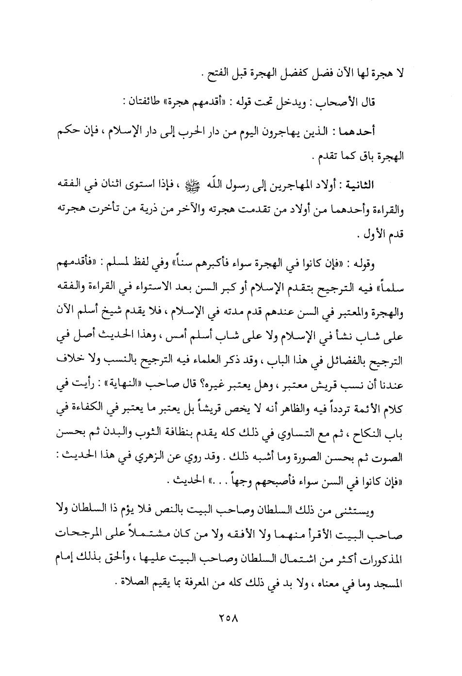 الثانية: أولاد المهاجرين إلى رسول الله - صلى الله عليه وسلم -، فإذا استوى اثنان في الفقه والقراءة وأحدهما من أولاد من تقدمت هجرته والآخر من ذرية من تأخرت هجرته قدم الأول.