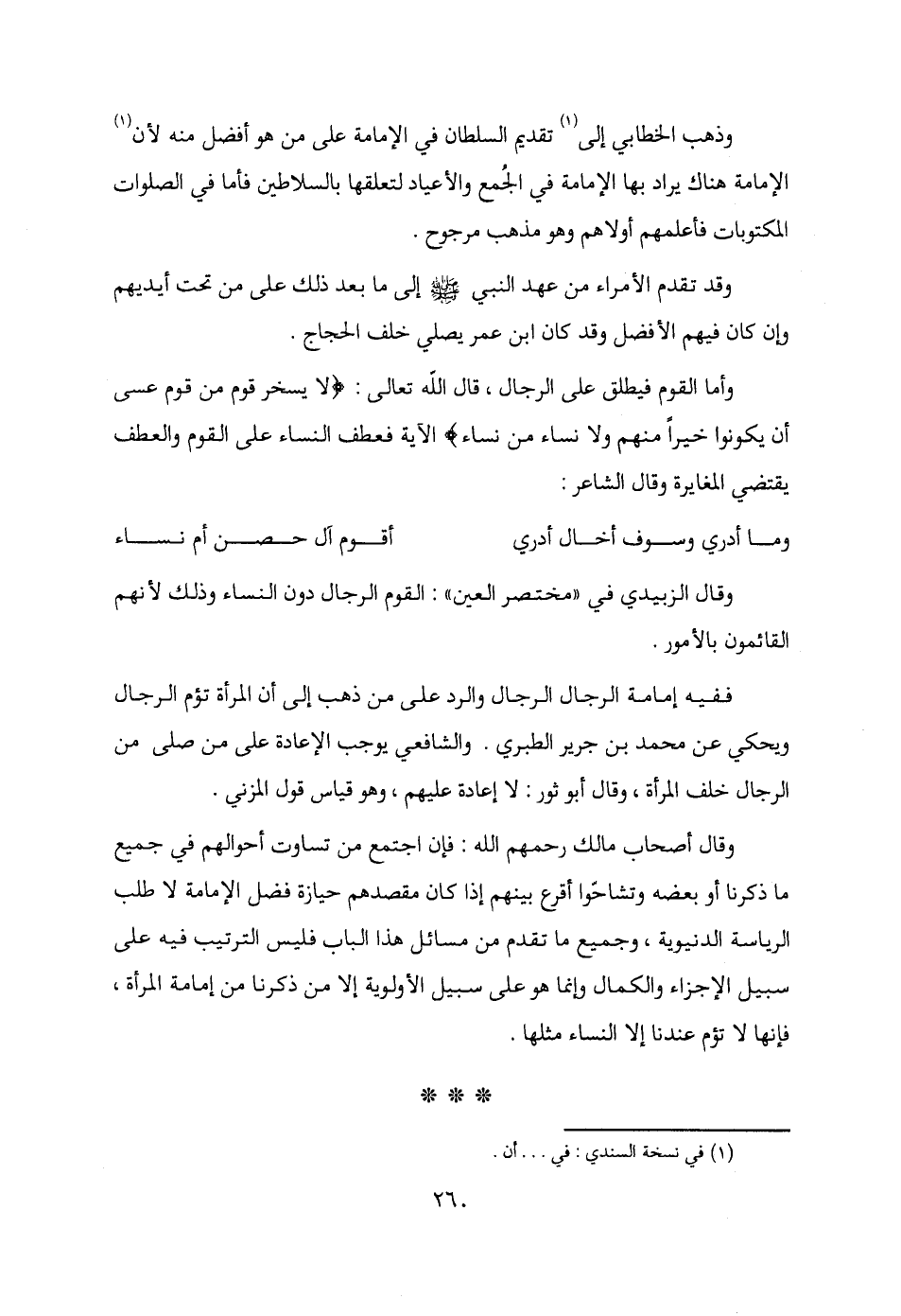 وذهب الخطابي إلى (¬1) تقديم السلطان في الإمامة على من هو أفضل منه لأن (1) الإمامة هناك يراد بها الإمامة في الجُمع والأعياد لتعلقها بالسلاطين فأما في الصلوات المكتوبات فأعلمهم أولاهم وهو مذهب مرجوح.