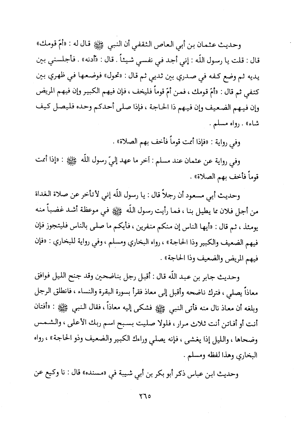 وحديث عثمان بن أبي العاص الثقفي أن النبي - صلى الله عليه وسلم - قال له: "أمّ قومك" قال: قلت يا رسول الله: إني أجد في نفسي شيئًا. قال: "ادنه". فأجلسني بين يديه ثم وضع كفه في صدري بين ثديي ثم قال: "تحول" فوضعها في ظهري بين كتفي ثم قال: "أمّ قومك، فمن أَمّ قومًا فليخف، فإن فيهم الكبير وإن فيهم المريض وإن فيهم الضعيف وإن فيهم ذا الحاجة، فإذا صلى أحدكم وحده فليصل كيف شاء". رواه مسلم.