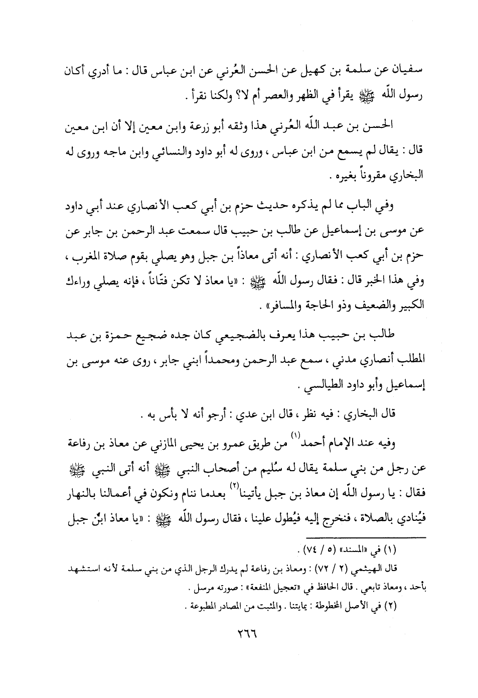قال الهيثمي (2/ 72): ومعاذ بن رفاعة لم يدرك الرجل الذي من بني سلمة لأنه استشهد بأحد، ومعاذ تابعي. قال الحافظ في "تعجيل المنفعة": صورته مرسل.