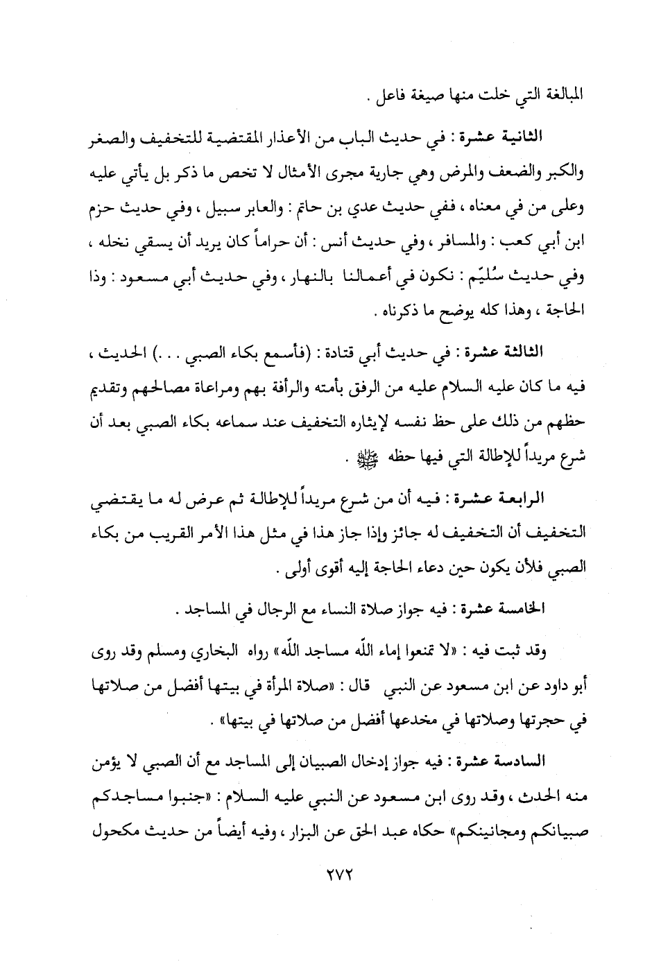 الثانية عشرة: في حديث الباب من الأعذار المقتضية للتخفيف والصغر والكبر والضعف والمرض وهي جارية مجرى الأمثال لا تخص ما ذكر بل يأتي عليه وعلى من في معناه، ففي حديث عدي بن حاتم: والعابر سبيل، وفي حديث حزم بن أبي كعب: والمسافر، وفي حديث أنس: أن حرامًا كان يريد أن يسقي نخله، وفي حديث سُليم: نكون في أعمالنا بالنهار، وفي حديث أبي مسعود: وذا الحاجة، وهذا كله يوضح ما ذكرناه.