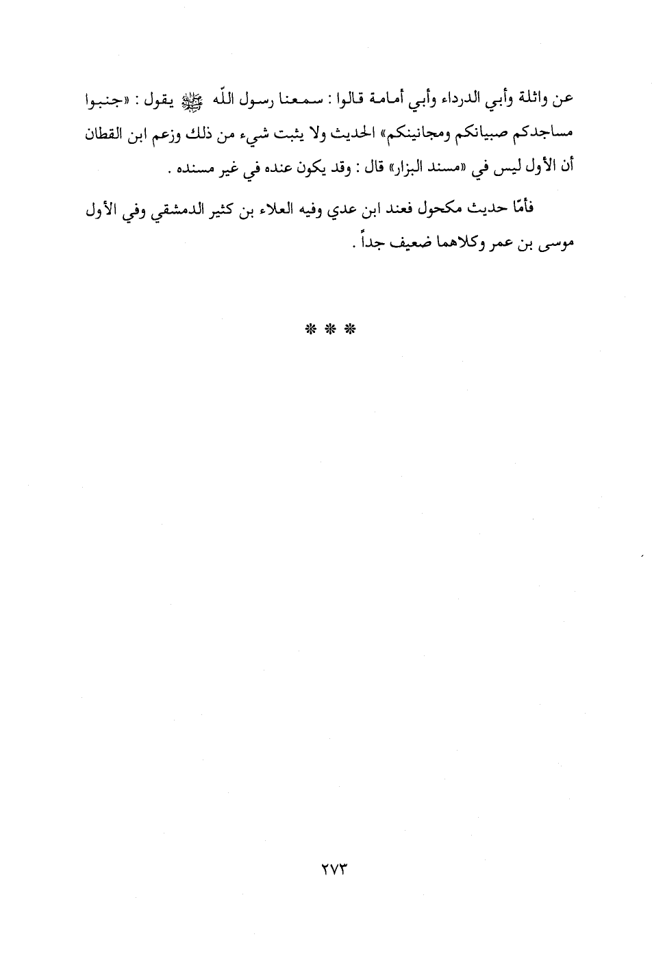 عن واثلة وأبي الدرداء وأبي أمامة قالوا: سمعنا رسول الله - صلى الله عليه وسلم - يقول: "جنبوا مساجدكم صبيانكم ومجانينكم" الحديث ولا يثبت شيء من ذلك وزعم ابن القطان أن الأول ليس في "مسند البزار" قال: وقد يكون عنده في غير مسنده.