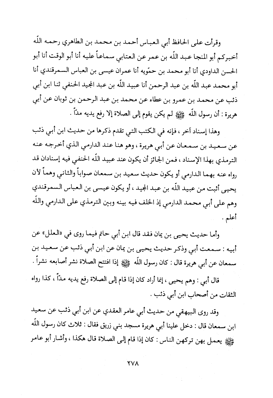وقرأت على الحافظ أبي العباس أحمد بن محمد بن الطاهري رحمه الله أخبركم أبو المنجا عبد الله بن عمر عن العتابي سماعًا عليه أنا أبو الوقت أنا أبو الحسن الداودي أنا أبو محمد بن حمّويه أنا عمران عيسى بن العباس السمرقندي أنا أبو محمد عبد الله بن عبد الرحمن أنا عبيد الله بن عبد المجيد الحنفي ثنا ابن أبي ذئب عن محمد بن عمرو بن عطاء عن محمد بن عبد الرحمن بن ثوبان عن أبي هريرة: أن رسول الله - صلى الله عليه وسلم - لم يكن يقوم إلى الصلاة إلا رفع يديه مدًّا.