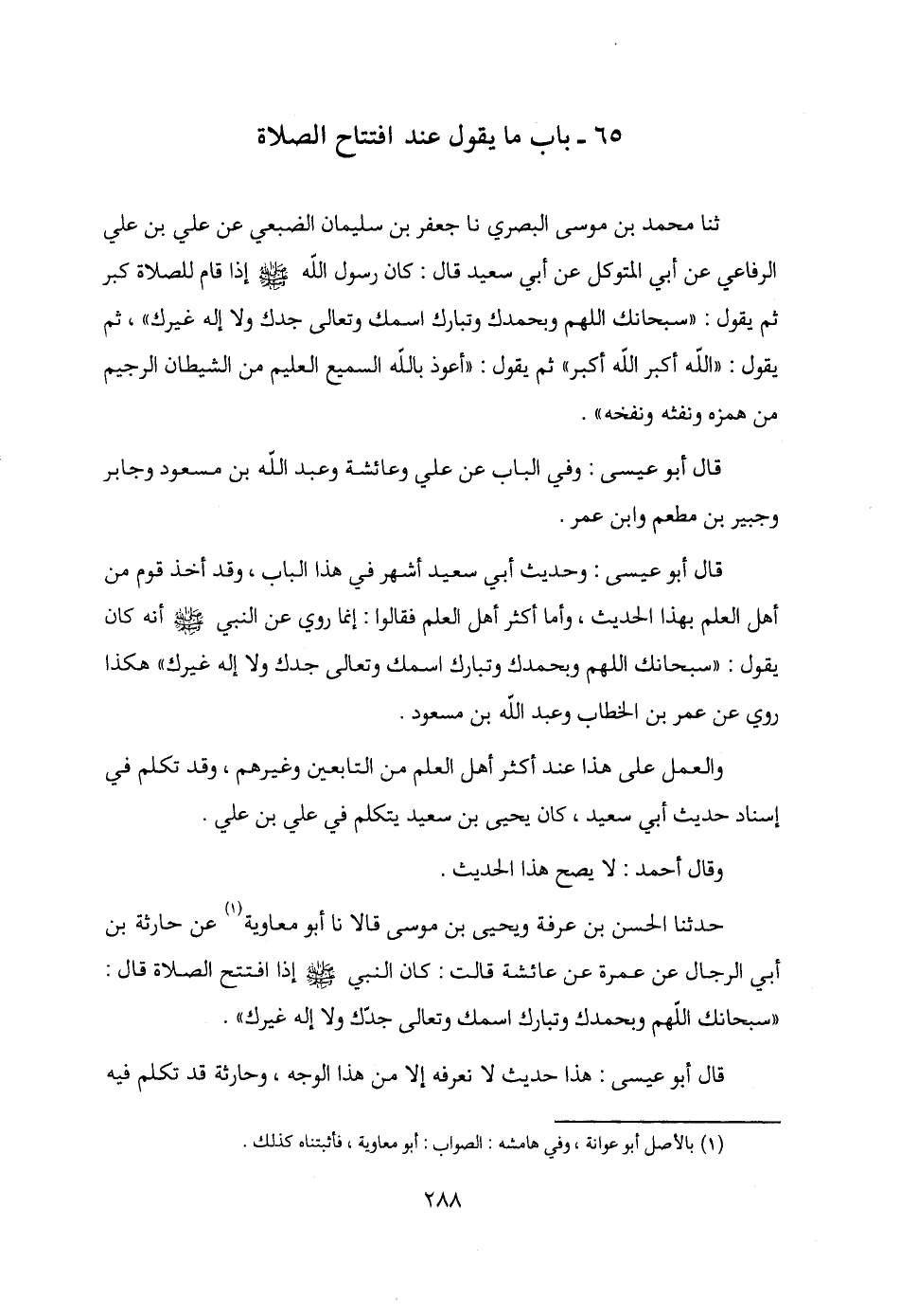 قال أبو عيسى: وحديث أبي سعيد أشهر في هذا الباب، وقد أخذ قوم من أهل العلم بهذا الحديث، وأما أكثر أهل العلم فقالوا: إنما روي عن النبي - صلى الله عليه وسلم - أنه كان يقول: "سبحانك اللهم وبحمدك وتبارك اسمك وتعالى جدك ولا إله غيرك" هكذا روي عن عمر بن الخطاب وعبد الله بن مسعود.