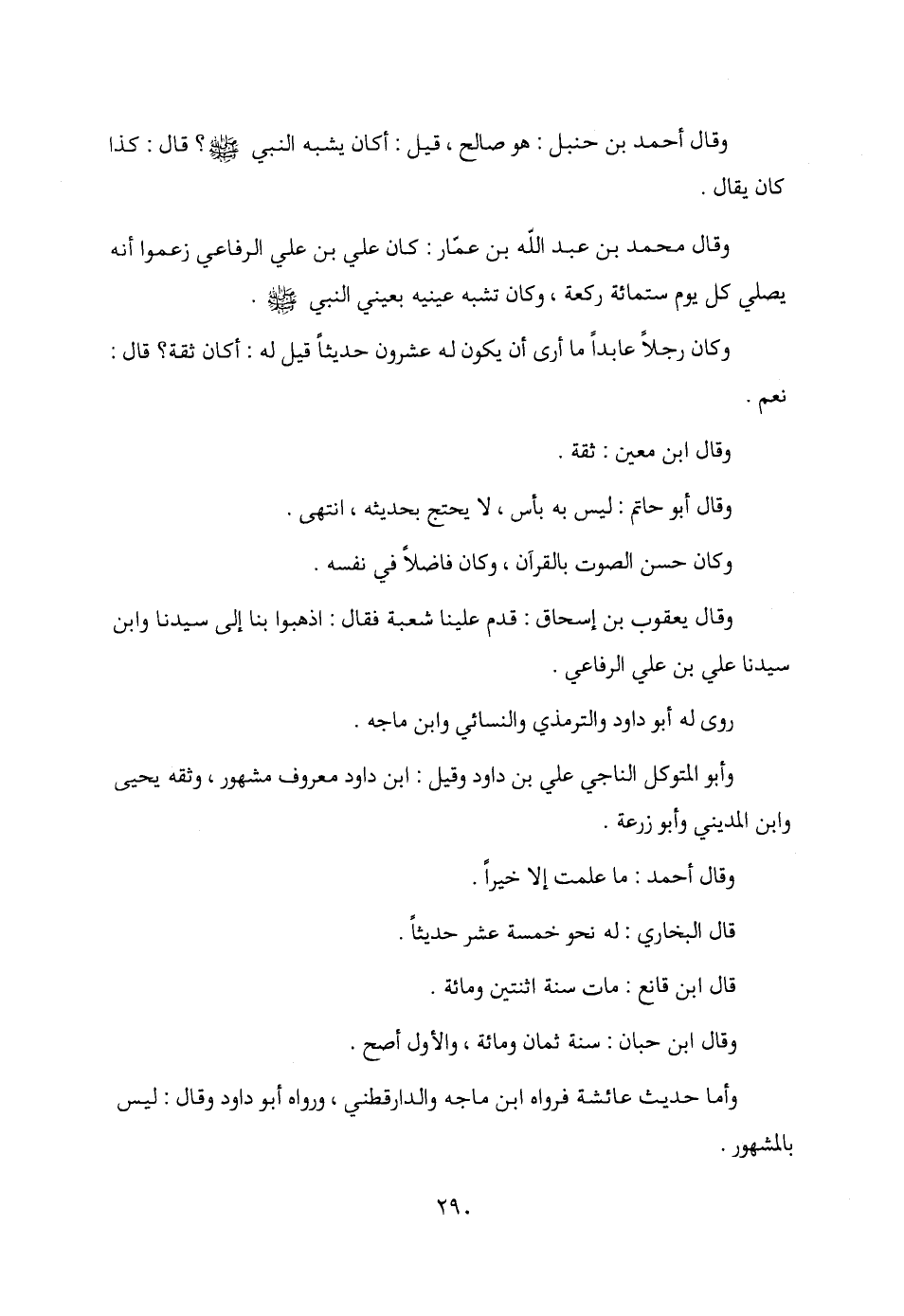 وقال محمد بن عبد الله بن عفار: كان علي بن علي الرفاعي زعموا أنه يصلي كل يوم ستمائة ركعة، وكان تشبه عينيه بعيني النبي - صلى الله عليه وسلم -.