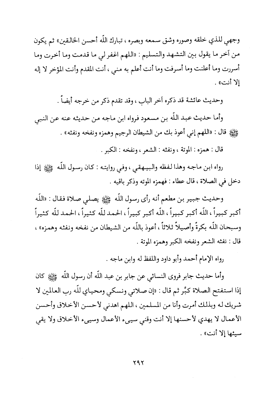 وحديث جبير بن مطعم أنه رأى رسول الله - صلى الله عليه وسلم - يصلي صلاة فقال: "الله أكبر كبيرًا، الله أكبر كبيرًا، الله أكبر كبيرًا، الحمد لله كثيرًا، الحمد لله كثيرًا وسبحان الله بكرةً وأصيلًا ثلاثًا، أعوذ بالله من الشيطان من نفخه ونفثه وهمزه"، قال: نفثه الشعر ونفخه الكبر وهمزه الموتة.