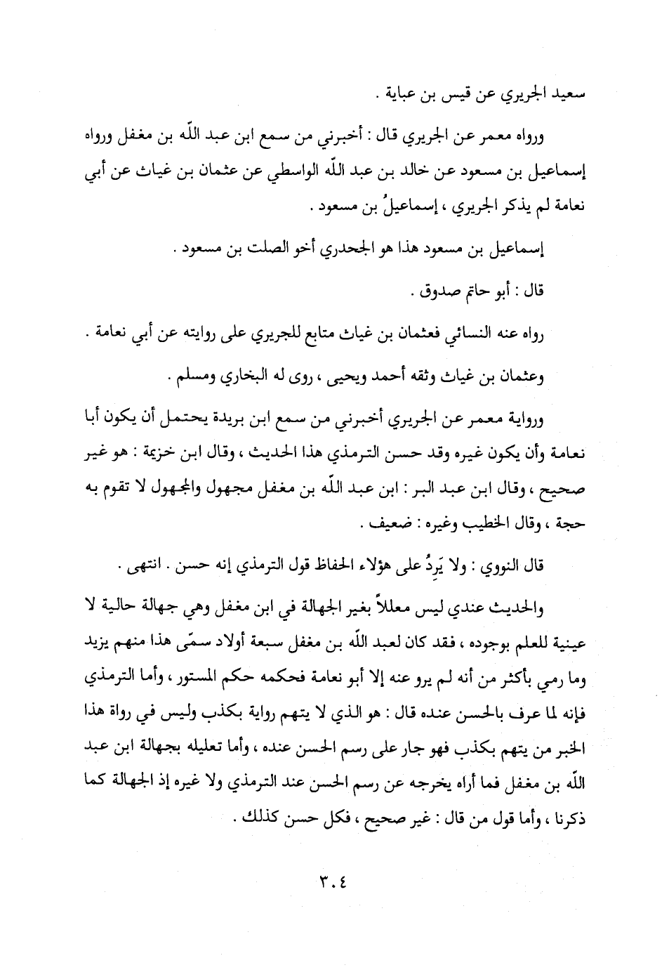 والحديث عندي ليس معللًا بغير الجهالة في ابن مغفل وهي جهالة حالية لا عينية للعلم بوجوده، فقد كان لعبد الله بن مغفل سبعة أولاد سمّى هذا منهم يزيد وما رمي بأكثر من أنه لم يرو عنه إلا أبو نعامة فحكمه حكم المستور، وأما الترمذي فإنه لما عرف بالحسن عنده قال: هو الذي لا يتهم رواية بكذب وليس في رواة هذا الخبر من يتهم بكذب فهو جارٍ على رسم الحسن عنده، وأما تعليله بجهالة ابن عبد الله بن مغفل فما أراه يخرجه عن رسم الحسن عند الترمذي ولا غيره إذ الجهالة كما ذكرنا، وأما قول من قال: غير صحيح، فكل حسن كذلك.