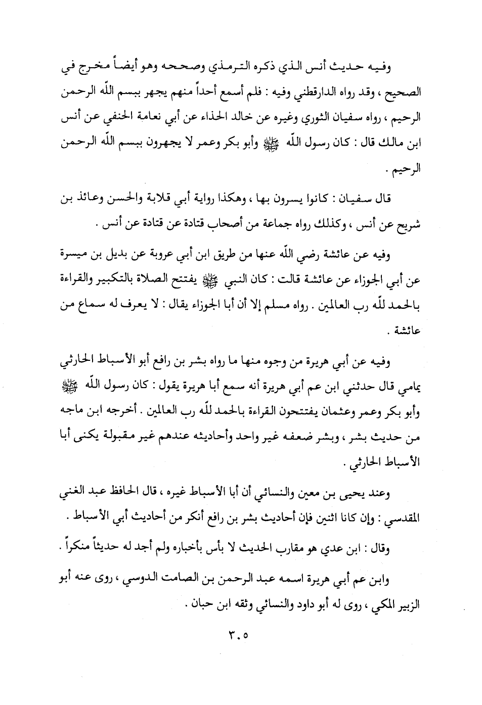 وفيه حديث أنس الذي ذكره الترمذي وصححه وهو أيضًا مخرج في الصحيح، وقد رواه الدارقطني وفيه: فلم أسمع أحدًا منهم يجهر ببِسْمِ اللَّهِ الرَّحْمَنِ الرَّحِيمِ، رواه سفيان الثوري وغيره عن خالد الحذاء عن أبي نعامة الحنفي عن أنس بن مالك قال: كان رسول الله - صلى الله عليه وسلم - وأبو بكر وعمر لا يجهرون ببِسْمِ اللَّهِ الرَّحْمَنِ الرَّحِيمِ.