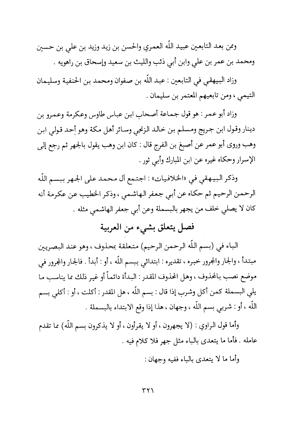 وذكر البيهقي في "الخلافيات": اجتمع آل محمد على الجهر ببِسْمِ اللَّهِ الرَّحْمَنِ الرَّحِيمِ ثم حكاه عن أبي جعفر الهاشمي، وذكر الخطيب عن عكرمة أنه كان لا يصلي خلف من يجهر بالبسملة وعن أبي جعفر الهاشمي مثله.