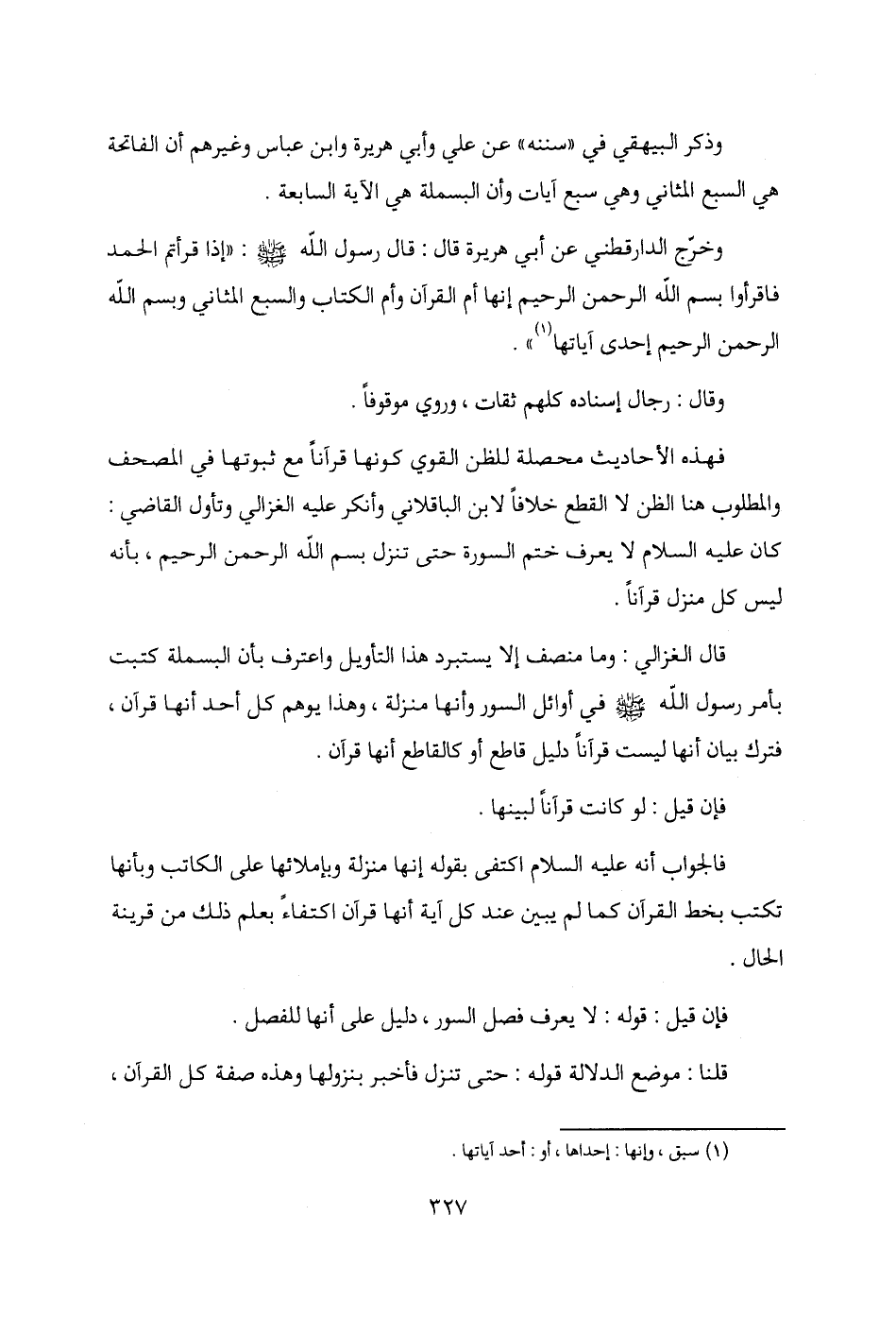 قال الغزالي: وما منصف إلا يستبرد هذا التأويل واعترف بأن البسملة كتبت بأمر رسول الله - صلى الله عليه وسلم - في أوائل السور وأنها منزلة، وهذا يوهم كل أحد أنها قرآن، فترك بيان أنها ليست قرآنًا دليل قاطع أو كالقاطع أنها قرآن.