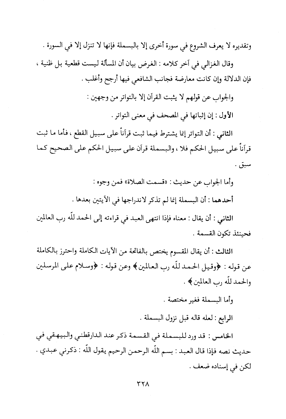 الثاني: أن التواتر إنما يشترط فيما ثبت قرآنًا على سبيل القطع، فأما ما ثبت قرآنًا على سبيل الحكم فلا، والبسملة قرآن على سبيل الحكم على الصحيح كما سبق.
