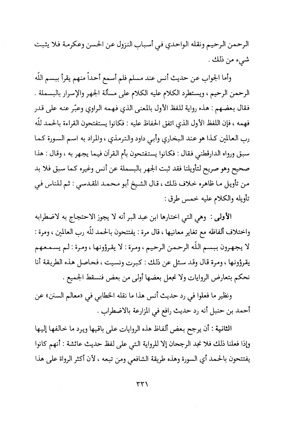 وأما الجواب عن حديث أنس عند مسلم فلم أسمع أحدًا منهم يقرأ ببِسْمِ اللَّهِ الرَّحْمَنِ الرَّحِيمِ، ويستطرد الكلام عليه الكلام على مسألة الجهر والإسرار بالبسملة. فقال بعضهم: هذه رواية للفظ الأول بالمعنى الذي فهمه الراوي وعبّر عنه على قدر فهمه، فإن اللفظ الأول الذي اتفق الحفاظ عليه: فكانوا يستفتحون القراءة بالحمد لله رب العالمين كذا هو عند البخاري وأبي داود والترمذي، والمراد به اسم السورة كما سبق ورواه الدارقطني فقال: فكانوا يستفتحون بأم القرآن فيما يجهر به، وقال: هذا صحيح وهو صريح لتأويلنا فقد ثبت الجهر بالبسملة عن أنس وغيره كما سبق فلا بد من تأويل ما ظاهره خلاف ذلك، قال الشيخ أبو محمد المقدسي: ثم للناس في تأويله والكلام عليه خمس طرق: