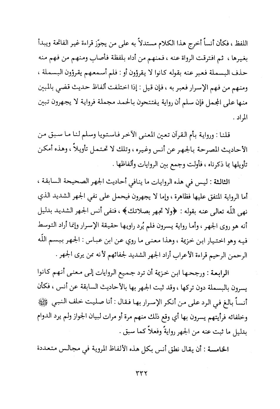 الثالثة: ليس في هذه الروايات ما ينافي أحاديث الجهر الصحيحة السابقة، أما الرواية المتفق عليها فظاهرة، وإما لا يجهرون فيحمل على نفي الجهر الشديد الذي نهى الله تعالى عنه بقوله: {ولا تجهر بصلاتك}، فنفى أنس الجهر الشديد بدليل أنه هو روى الجهر، وأما رواية يسرون فلم يُرد راويها حقيقة الإسرار وإنما أراد التوسط فيه وهو اختيار ابن خزيمة، وهذا معنى ما روي عن ابن عباس: الجهر ببِسْمِ اللَّهِ الرَّحْمَنِ الرَّحِيمِ قراءة الأعراب أراد الجهر الشديد لجفائهم لأنه ممن يرى الجهر.