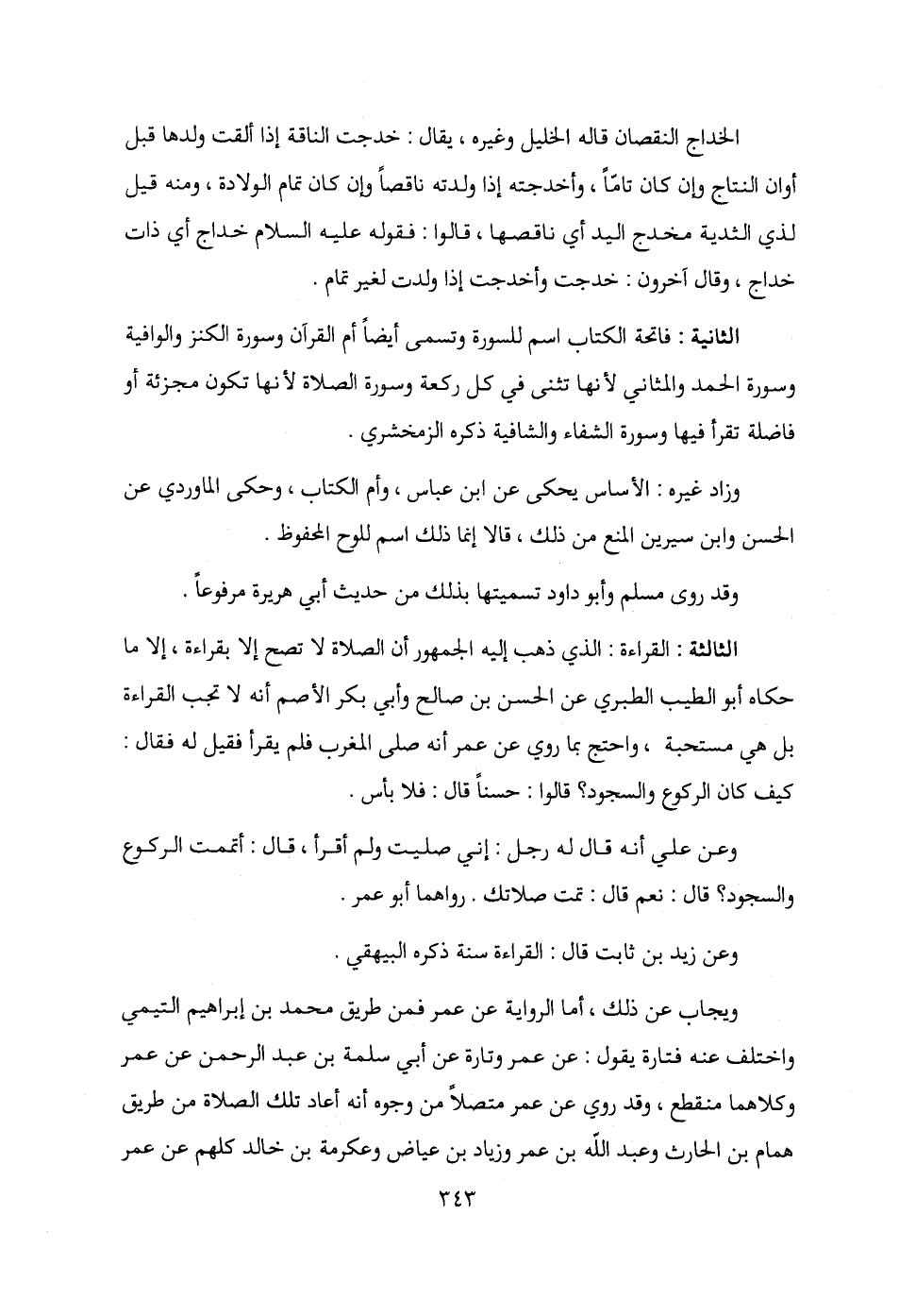 الثالثة: القراءة: الذي ذهب إليه الجمهور أن الصلاة لا تصح إلا بقراءة، إلا ما حكاه أبو الطيب الطبري عن الحسن بن صالح وأبي بكر الأصم أنه لا تجب القراءة بل هي مستحبة، واحتج بما روي عن عمر أنه صلى المغرب فلم يقرأ فقيل له فقال: كيف كان الركوع والسجود؟ قالوا: حسنًا قال: فلا بأس.