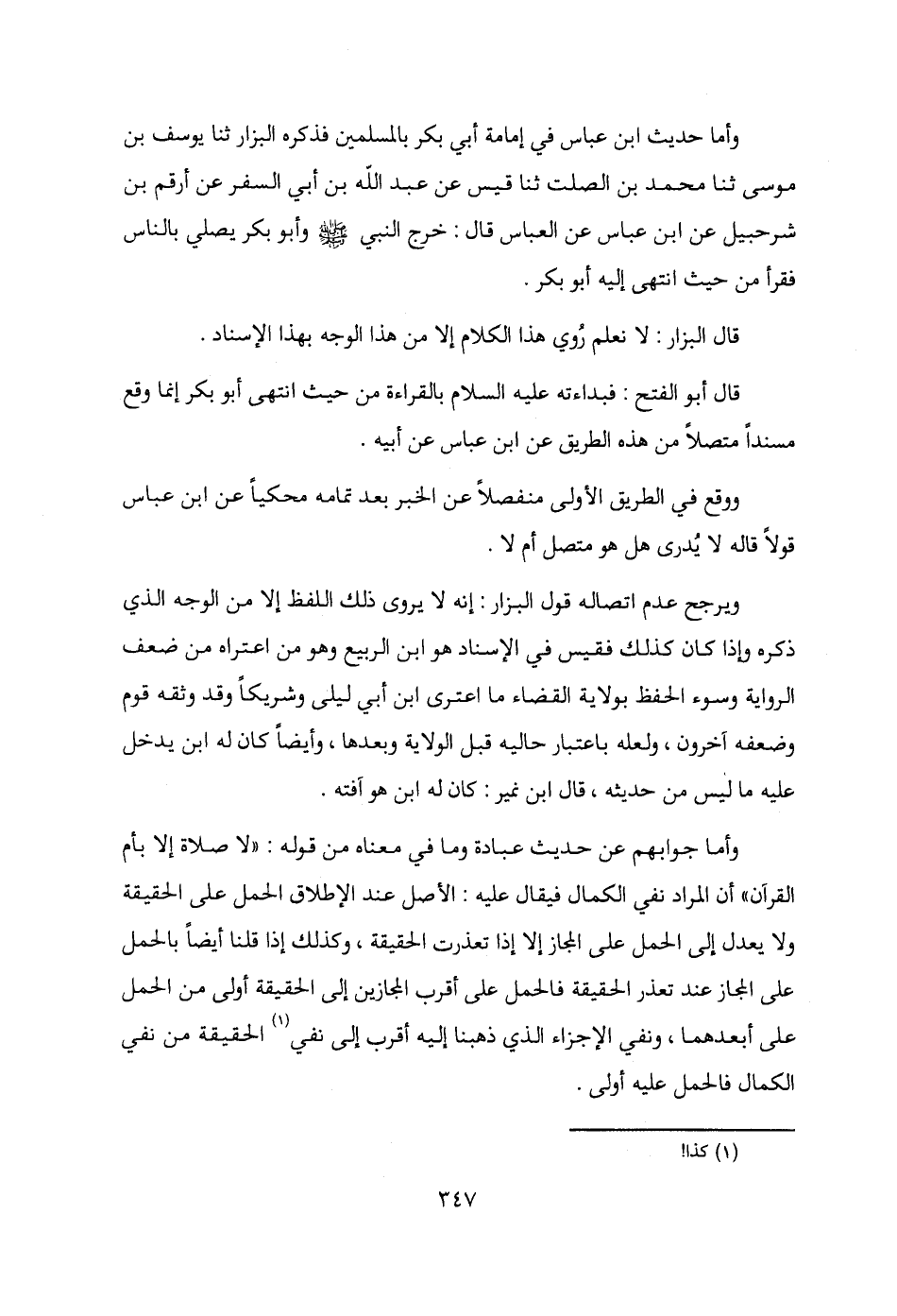 وأما جوابهم عن حديث عبادة وما في معناه من قوله: "لا صلاة إلا بأم القرآن" أن المراد نفي الكمال فيقال عليه: الأصل عند الإطلاق الحمل على الحقيقة ولا يعدل إلى الحمل على المجاز إلا إذا تعذرت الحقيقة، وكذلك إذا قلنا أيضًا بالحمل على المجاز عند تعذر الحقيقة فالحمل على أقرب المجازين إلى الحقيقة أولى من الحمل على أبعدهما، ونفي الإجزاء الذي ذهبنا إليه أقرب إلى نفي (¬1) الحقيقة من نفي الكمال فالحمل عليه أولى.
